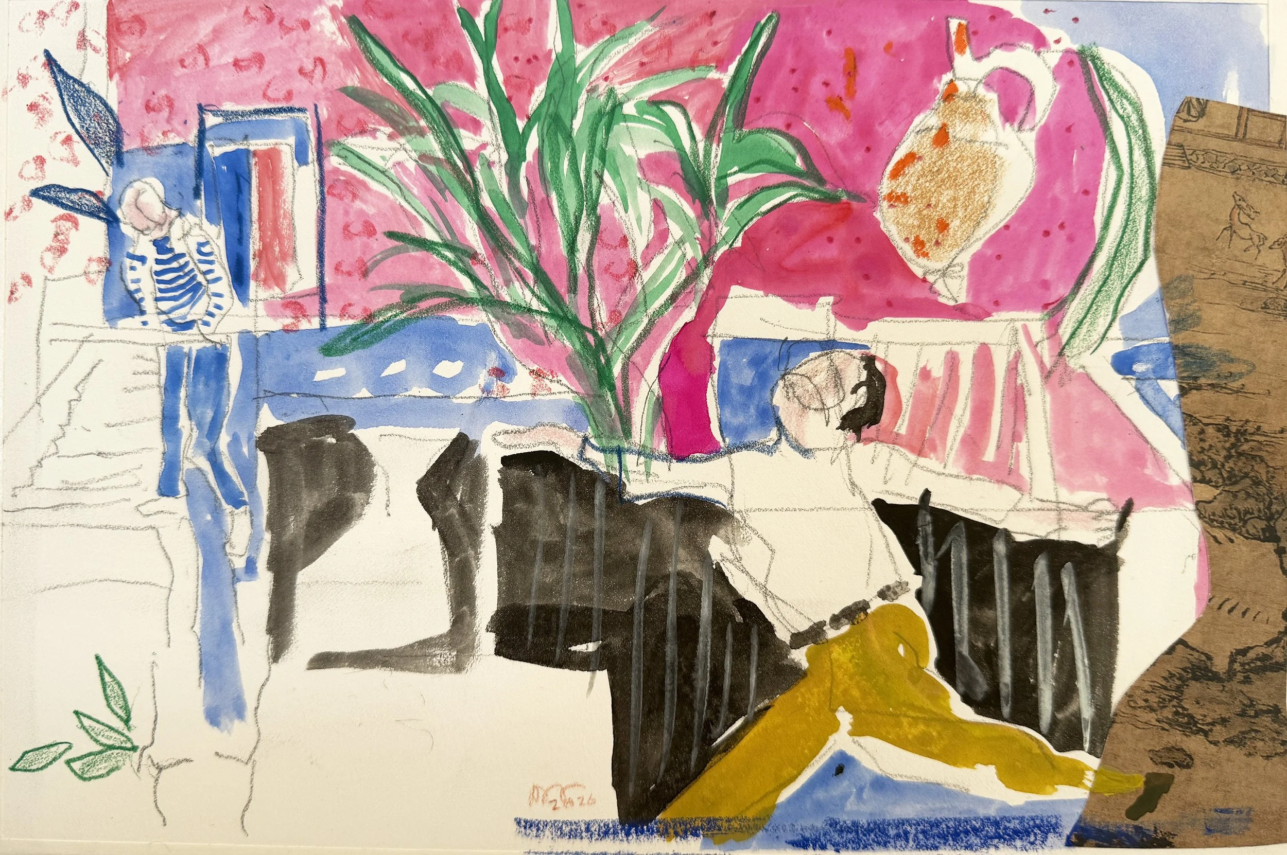 2025 watercolor/collage, 11 1/2x 14 1/2”