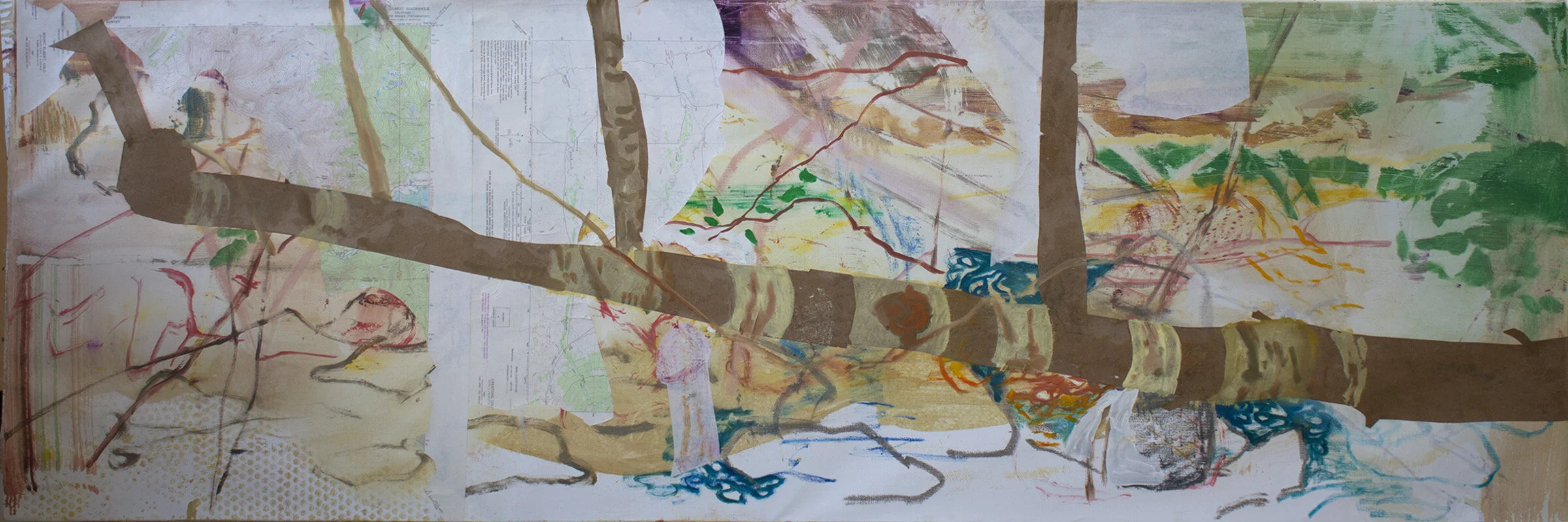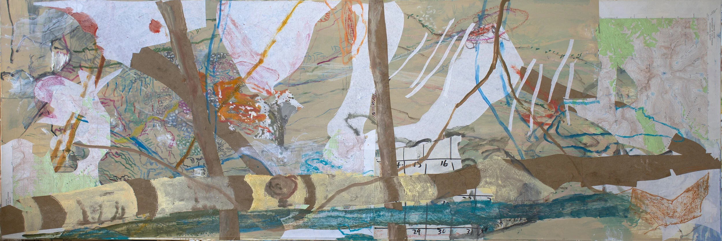 6/10/2021 creek oil/collage 78 x 26” oil, oil stick & collage on portrait linen