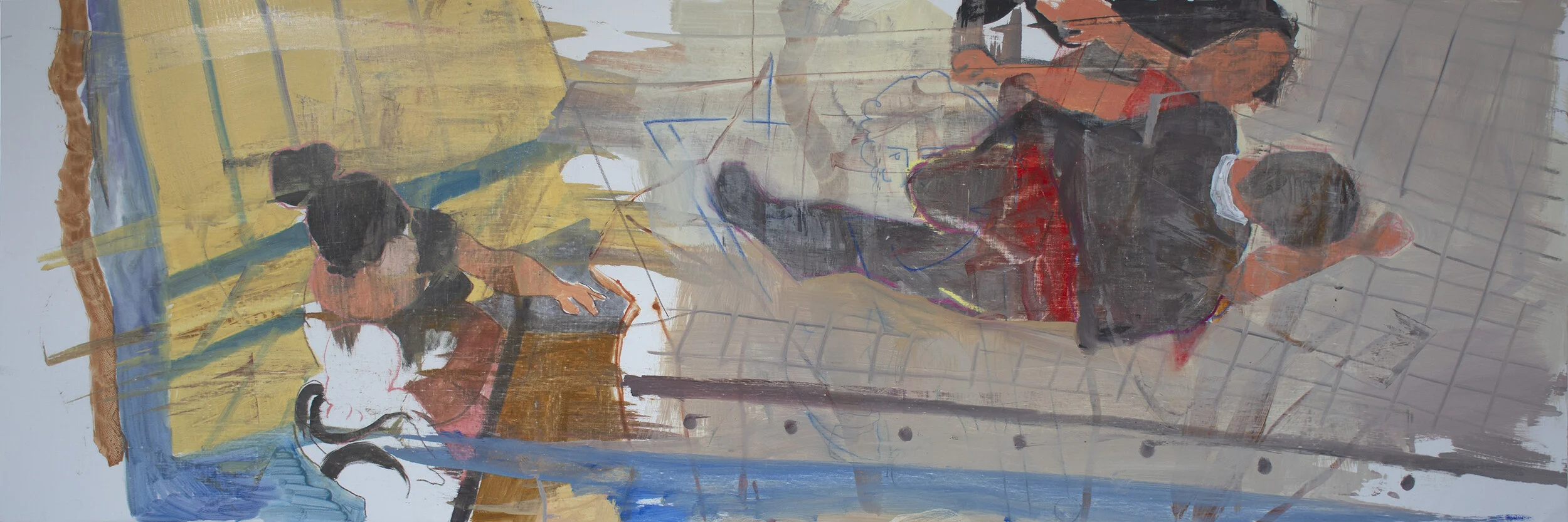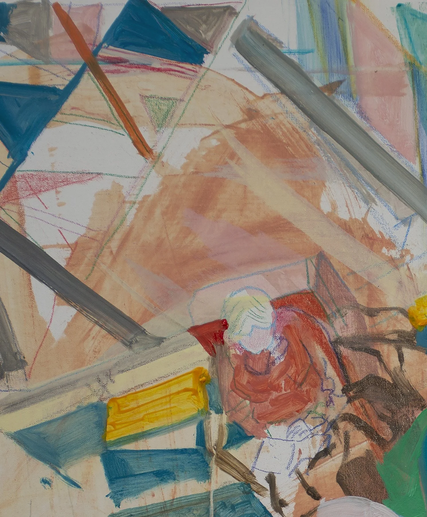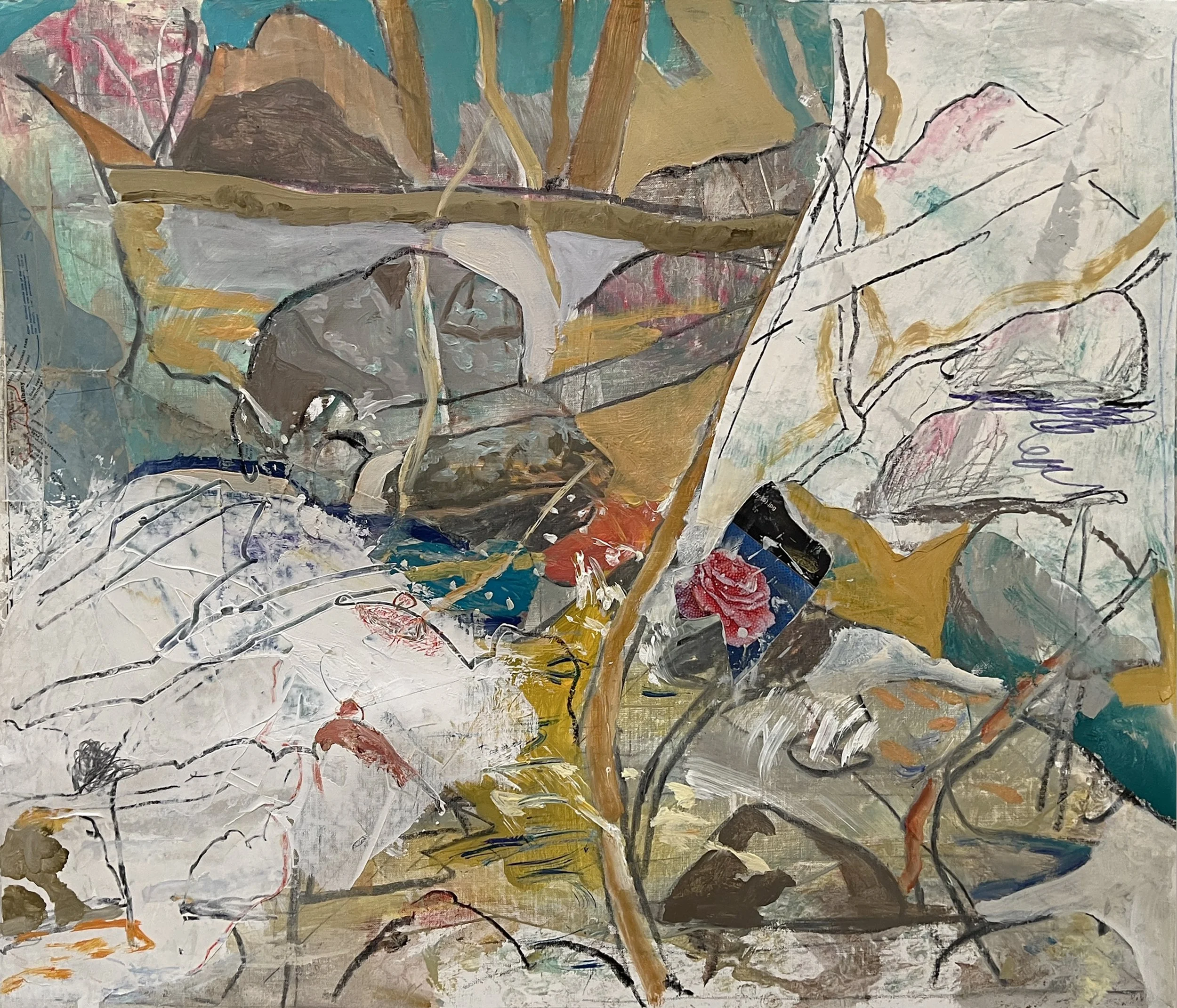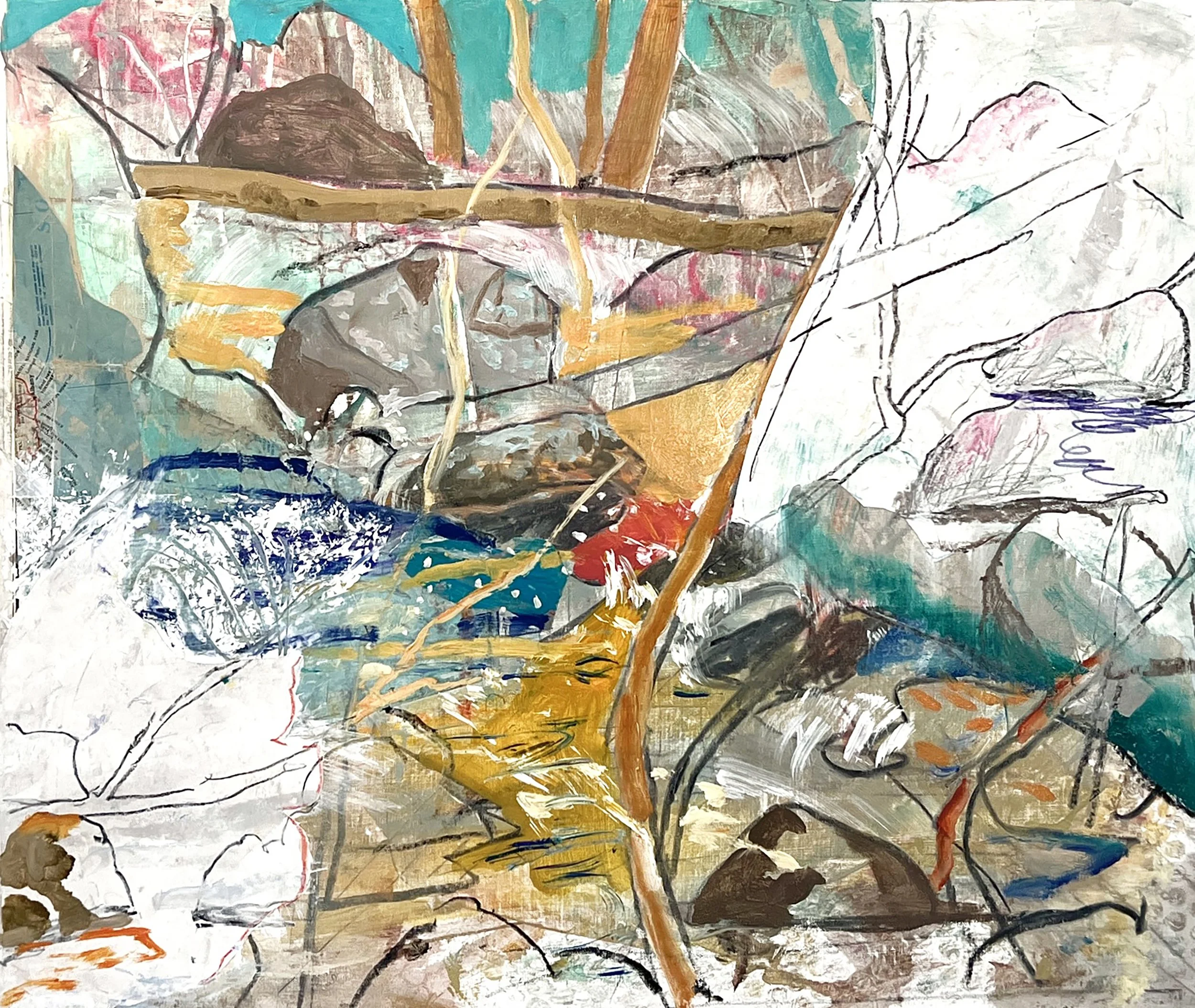 DETAIL:ndancing creek II,oil & collage on portrait linen, 2024