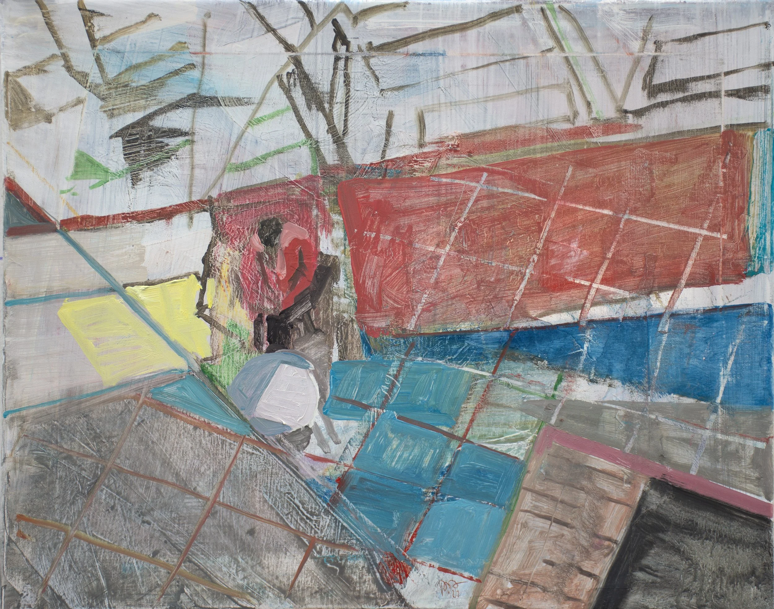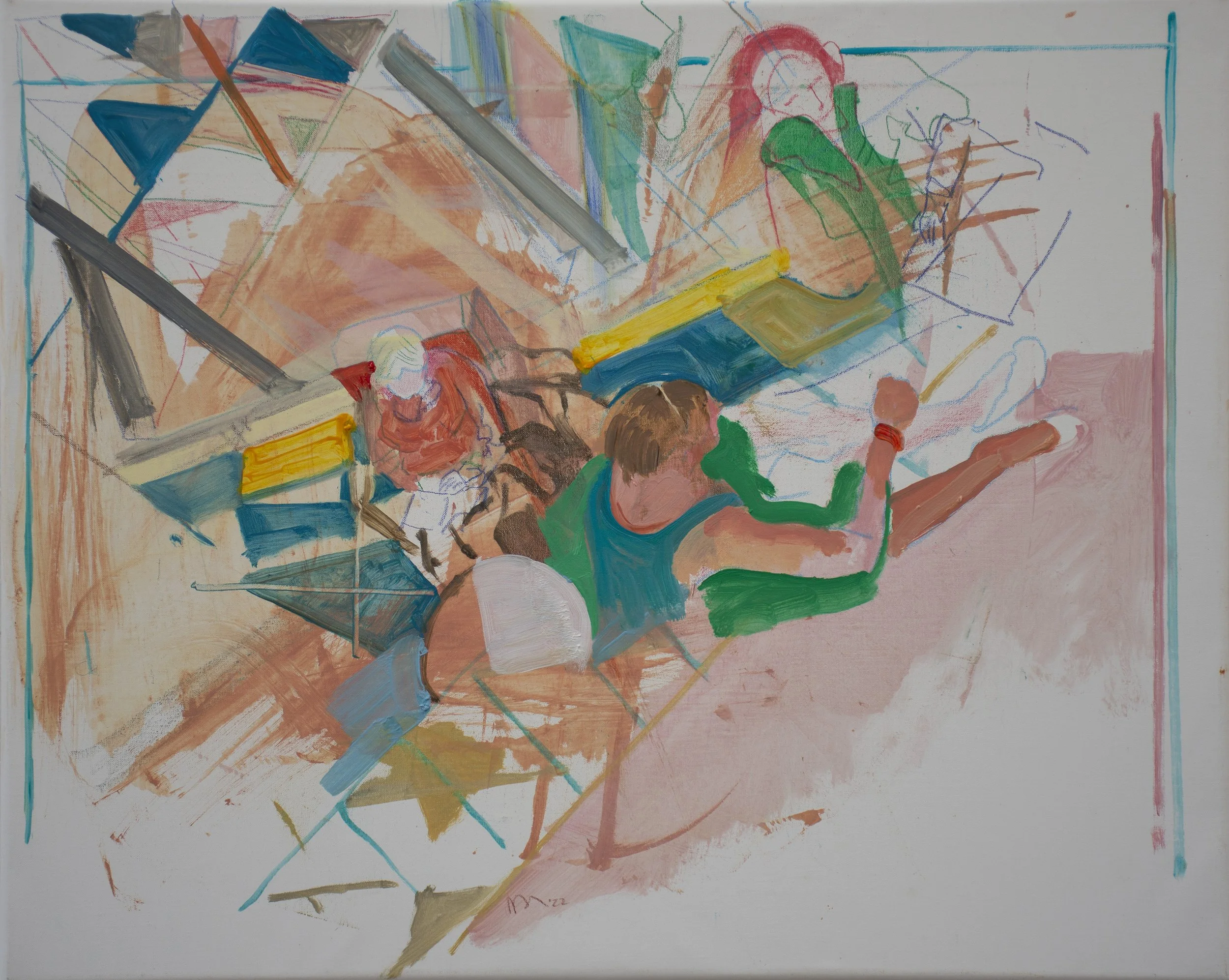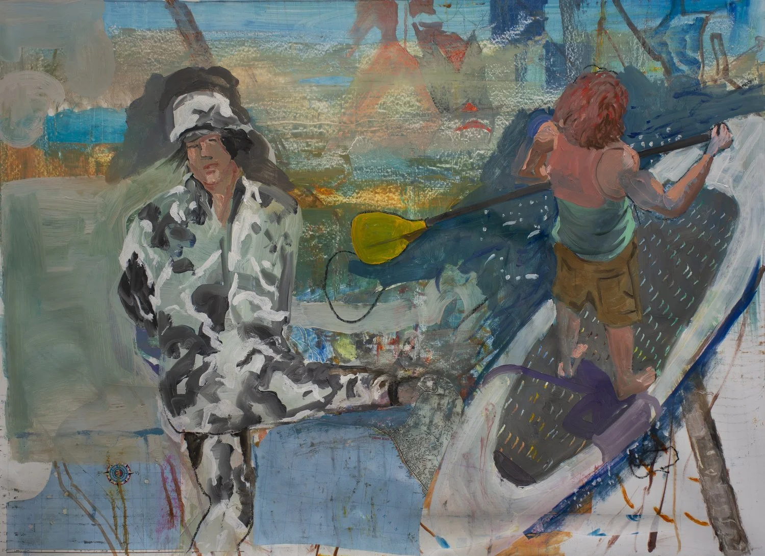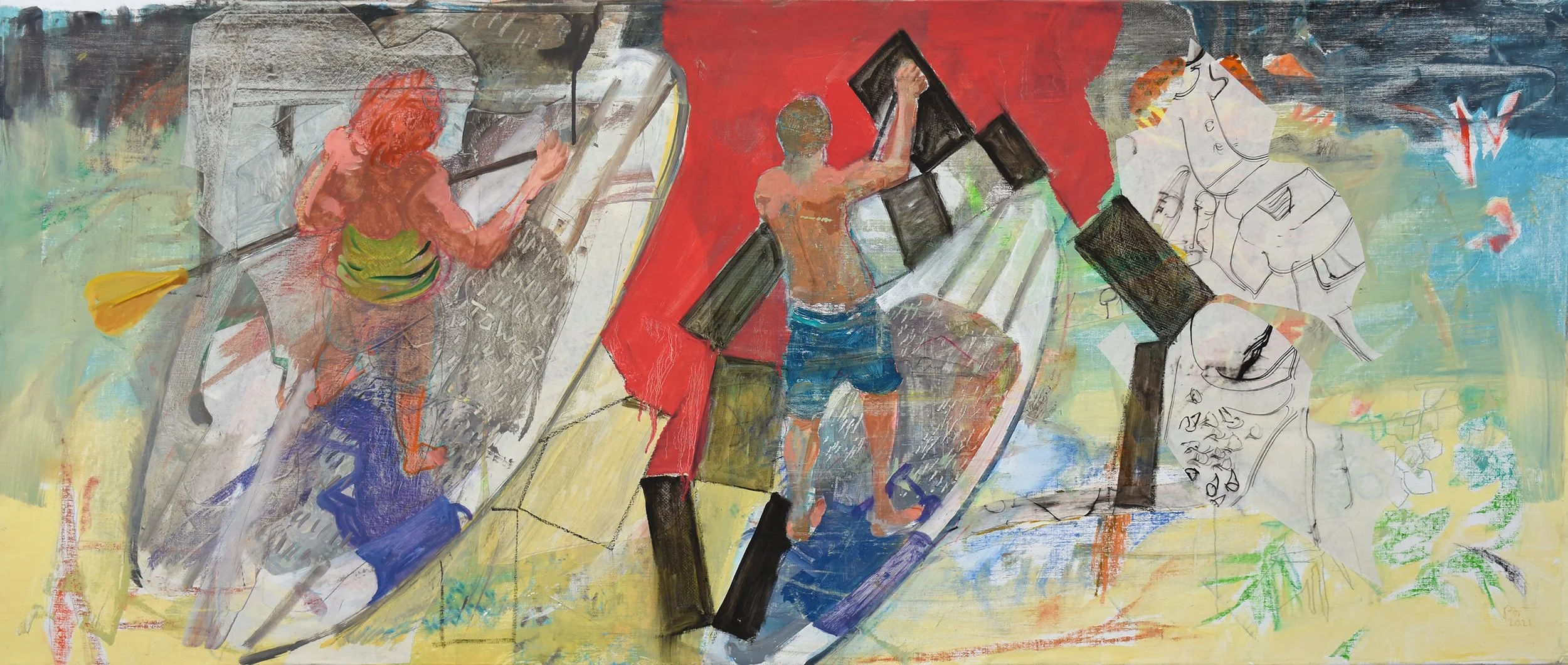 ABOVE: lower rt: paddlers on bright yellow, 38x44” oil and collage on portrait linen was completed on 7/21/22 lower left: the red door, 38x40” oil & collage on portrait linen upper rt: desde arriba 32x42” oil on portrait linen