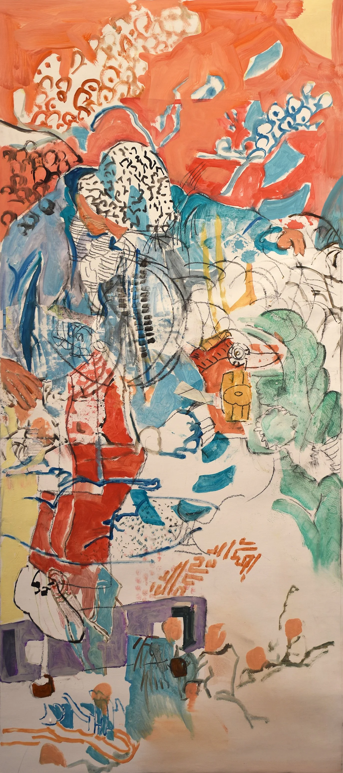 10/2/2021 painting/collage 26x62” oil, oil pastel & collage on portrait linen