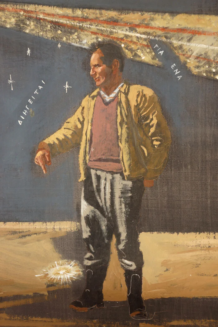 detail of the miracle, a painting of frangos, fisherman from the village of corthi, andros in various stages of telling the story of a miracle that occured when he was a child in asia minor.