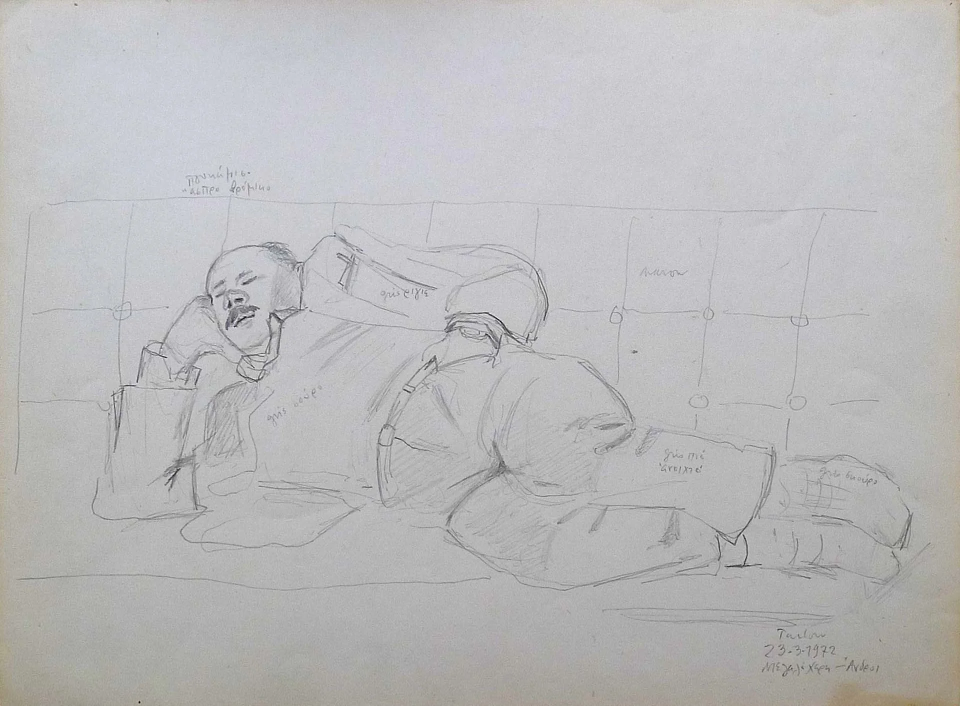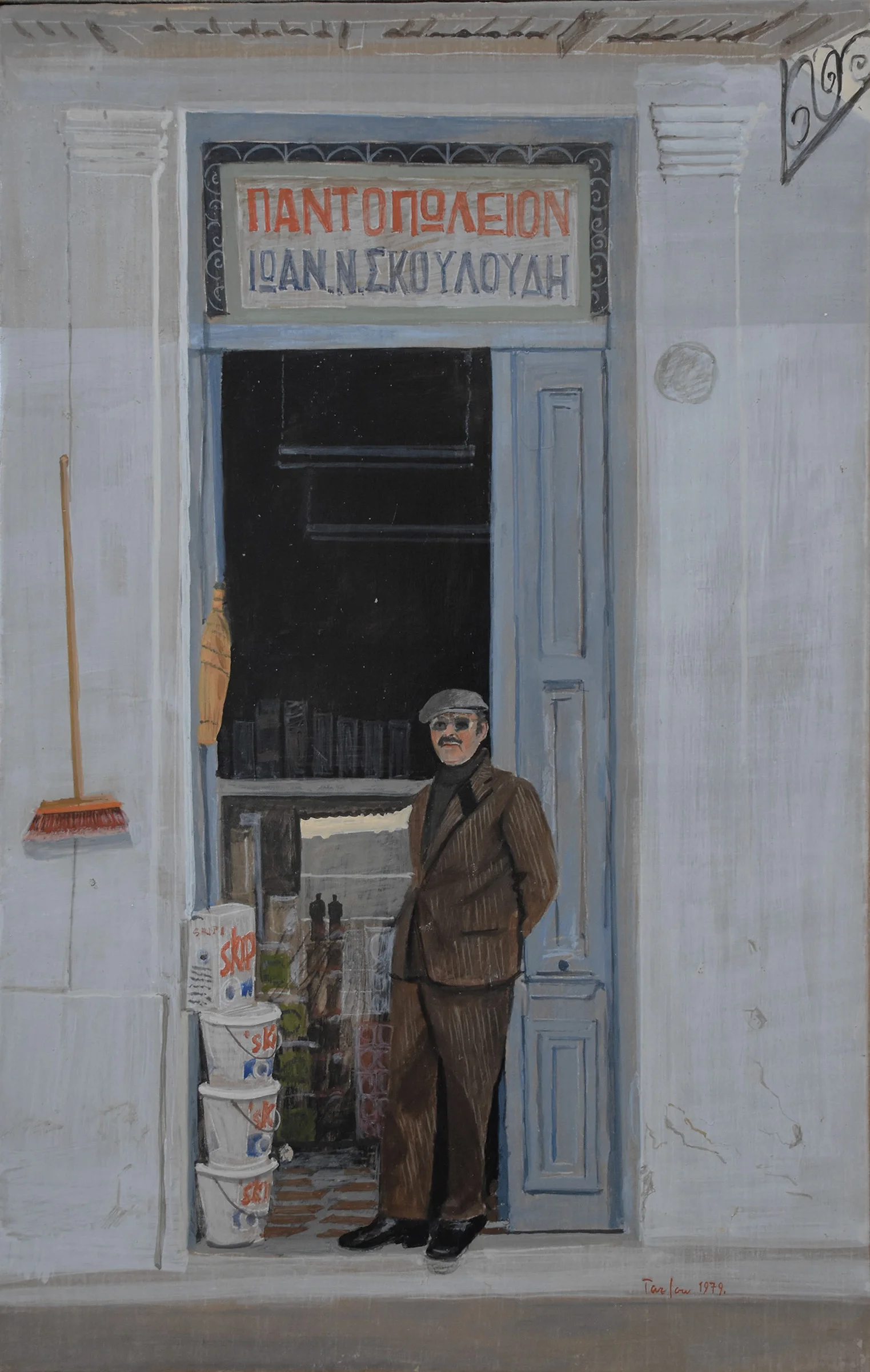 in my plaka studio in athens, at work on a painting of the street sweeper kyriakos, 1972. oil on linen, private collection, athens