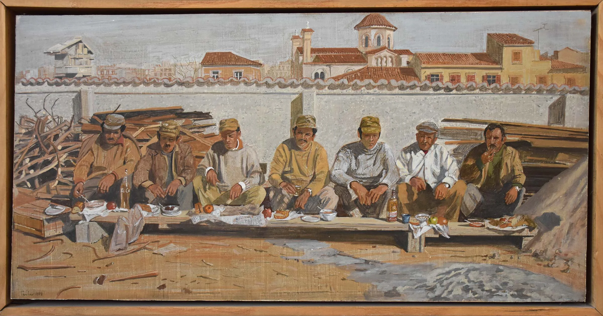 detail: kolatsio, construction workers on lunch break: egg tempera on board