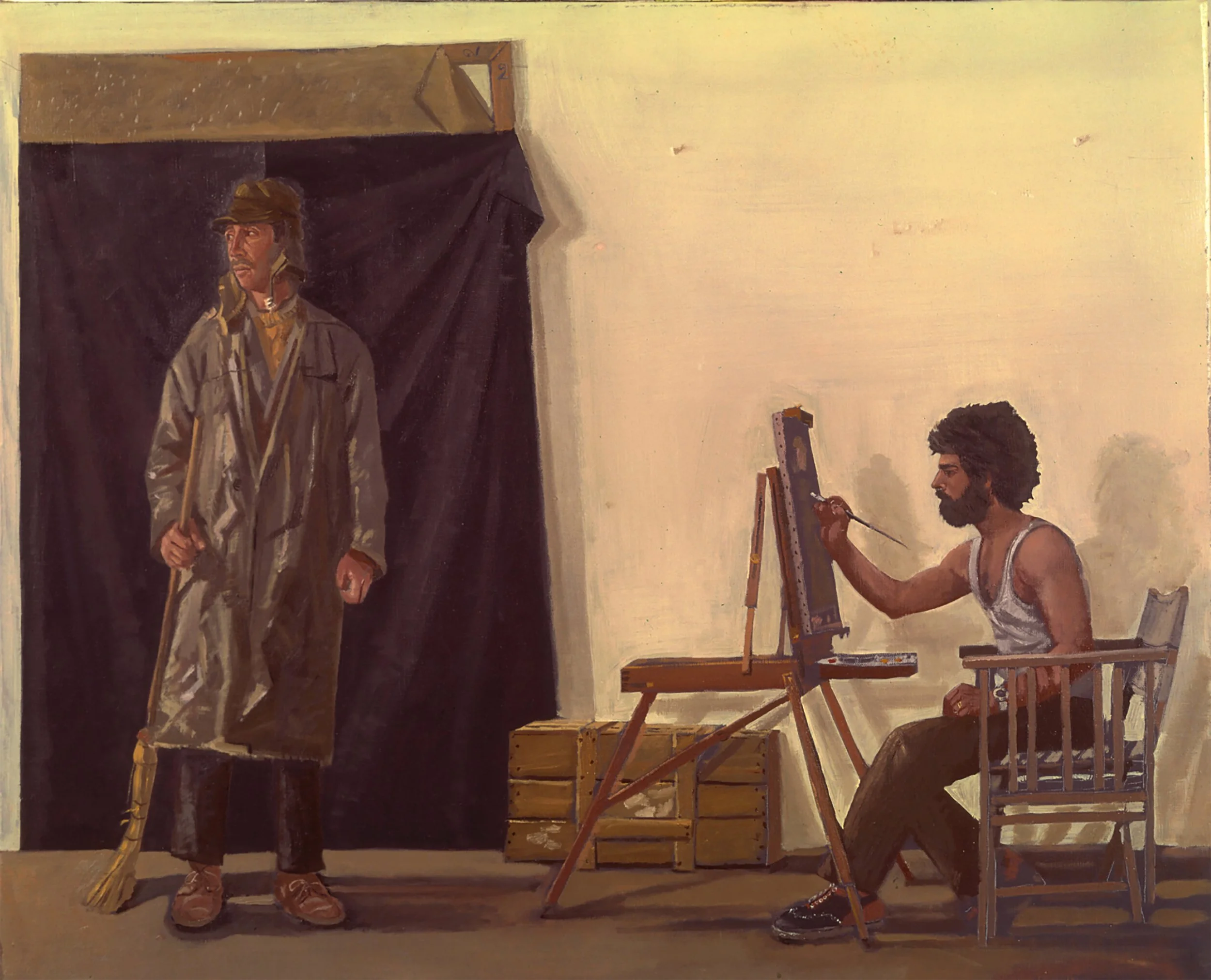 The Artist with Six Workmen, 1976, oil on linen purchased from my 1976 Ora Gallery exhibition, current whereabouts unknown