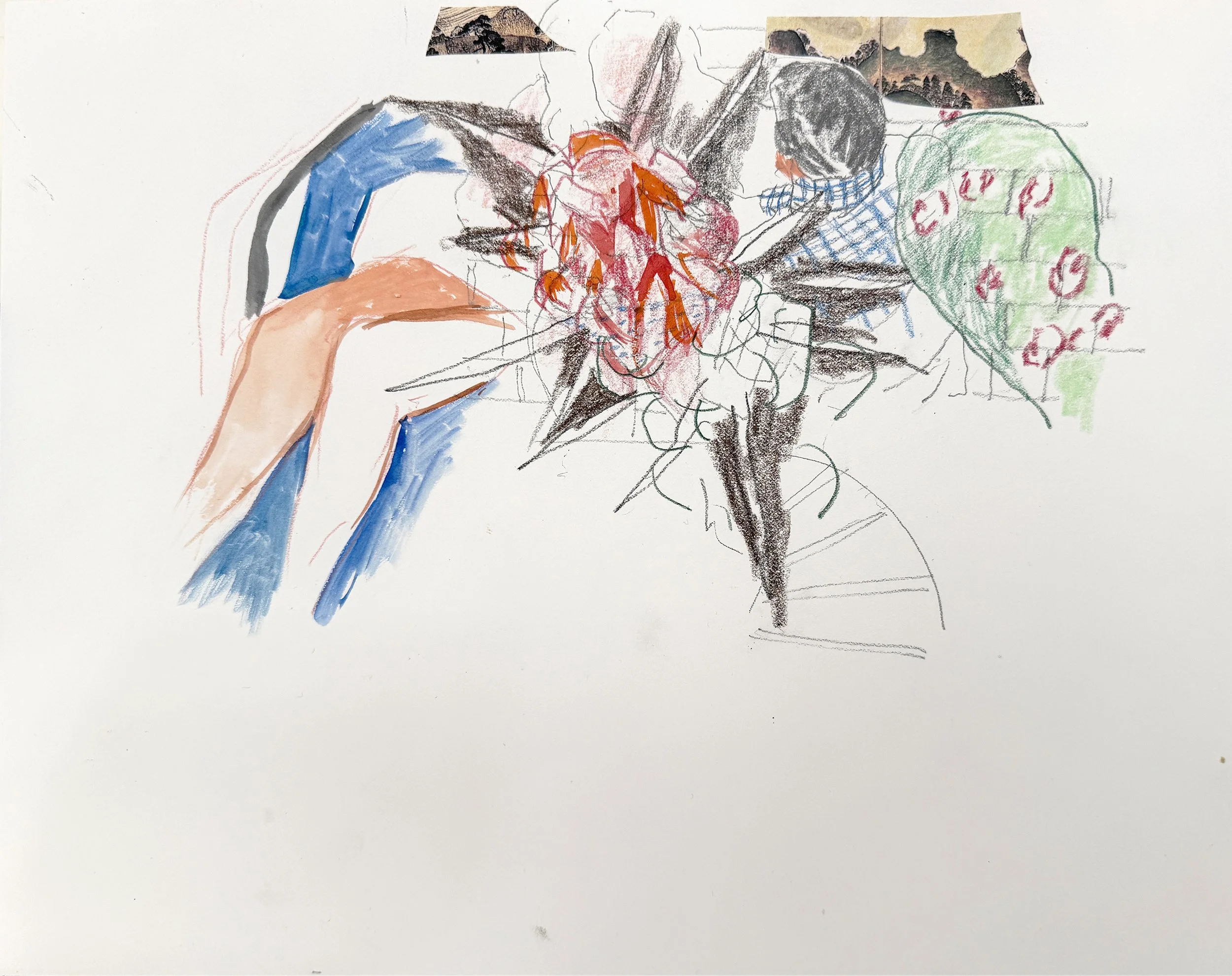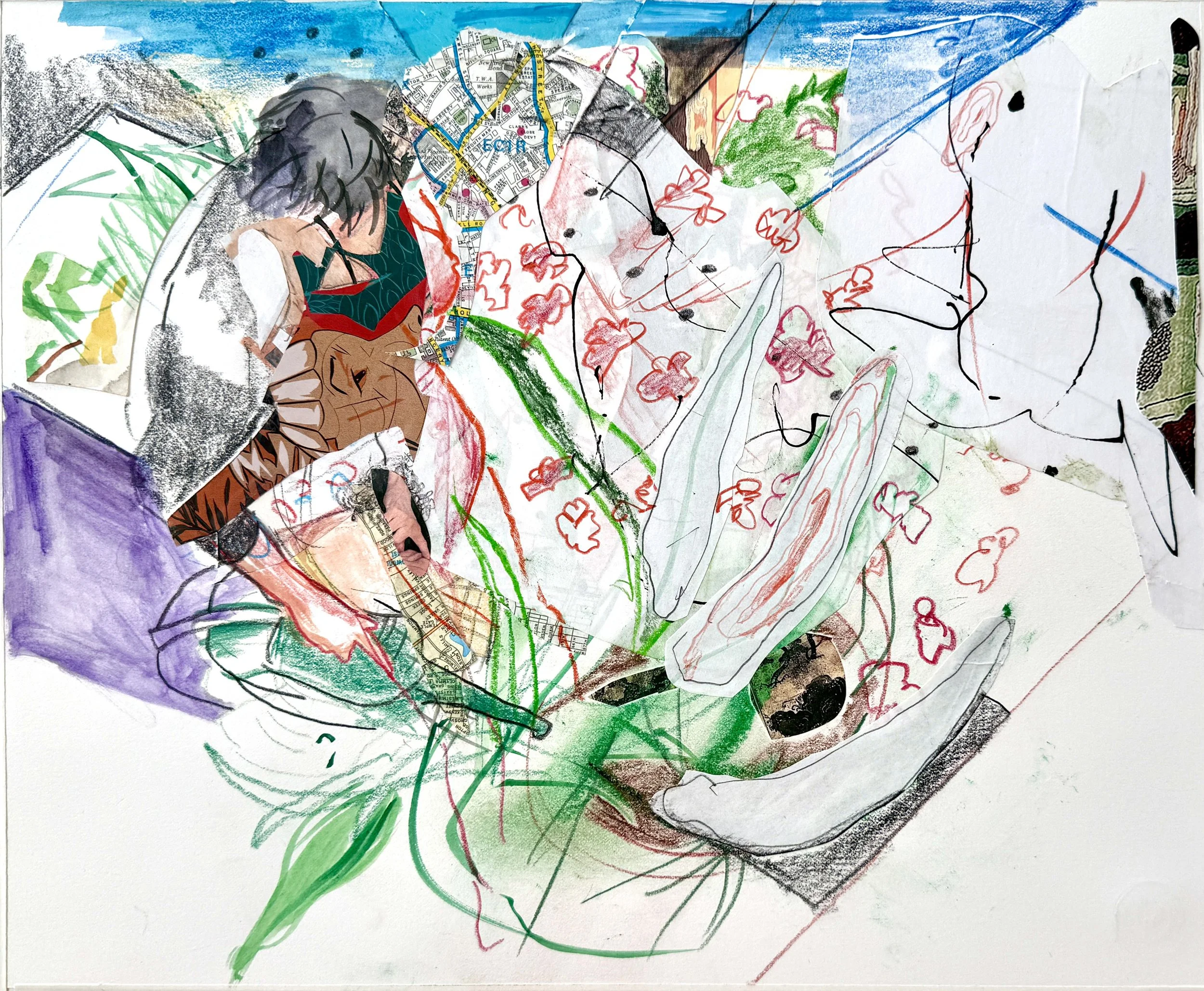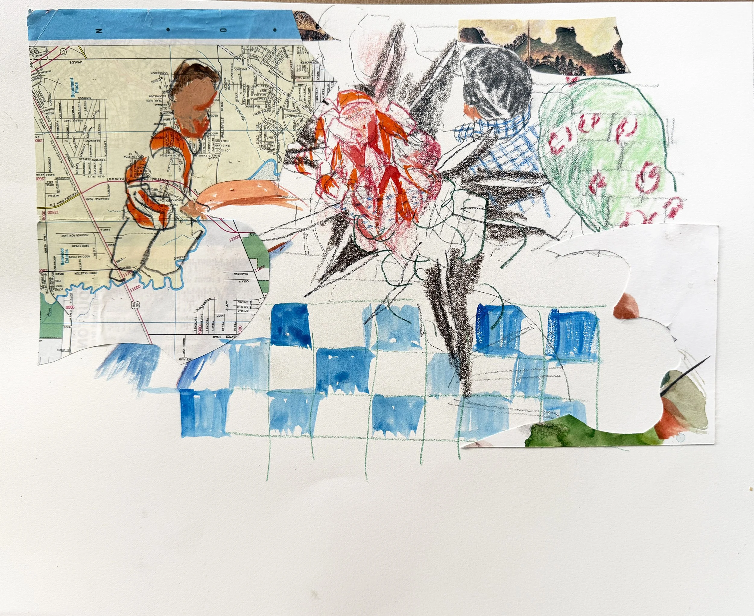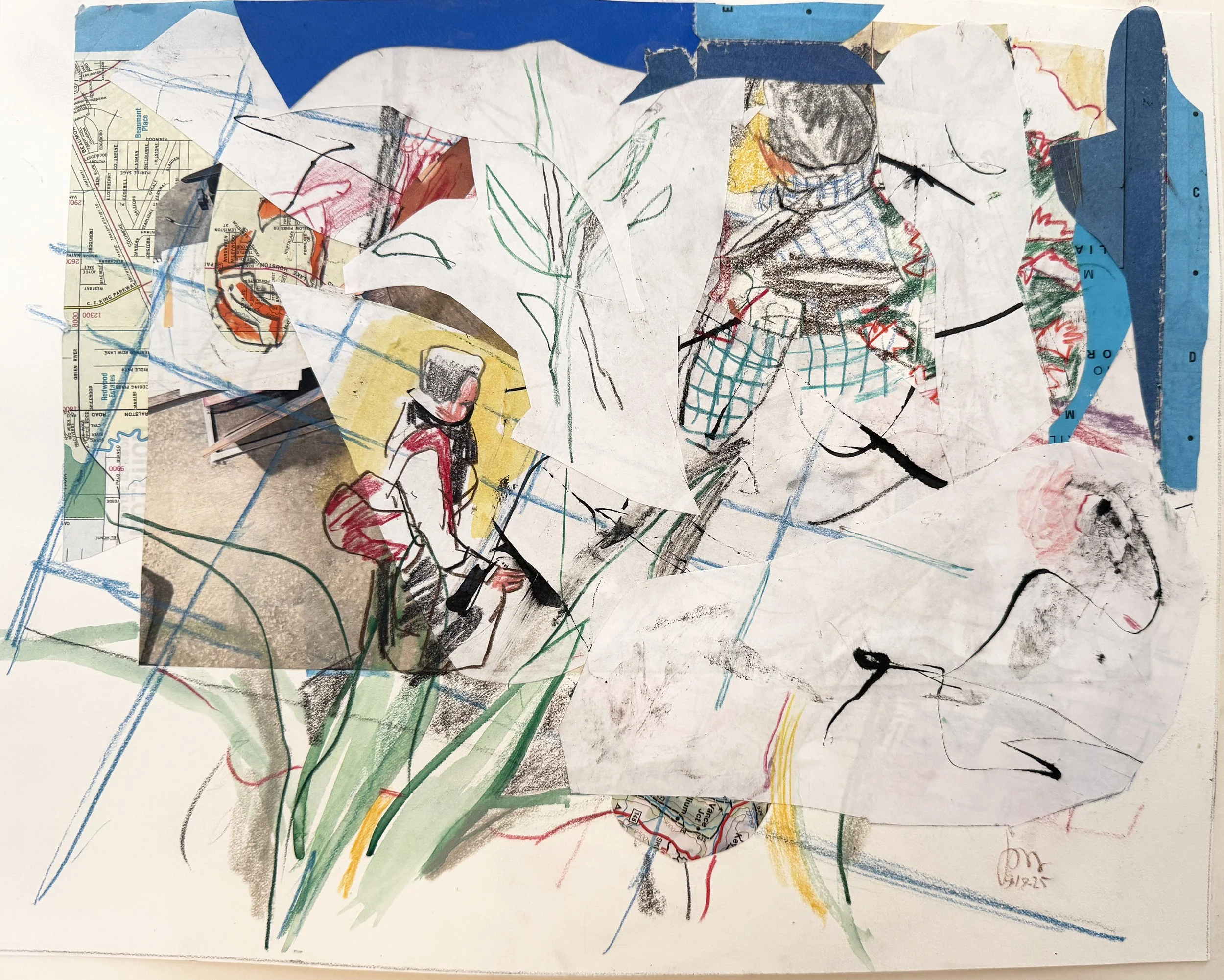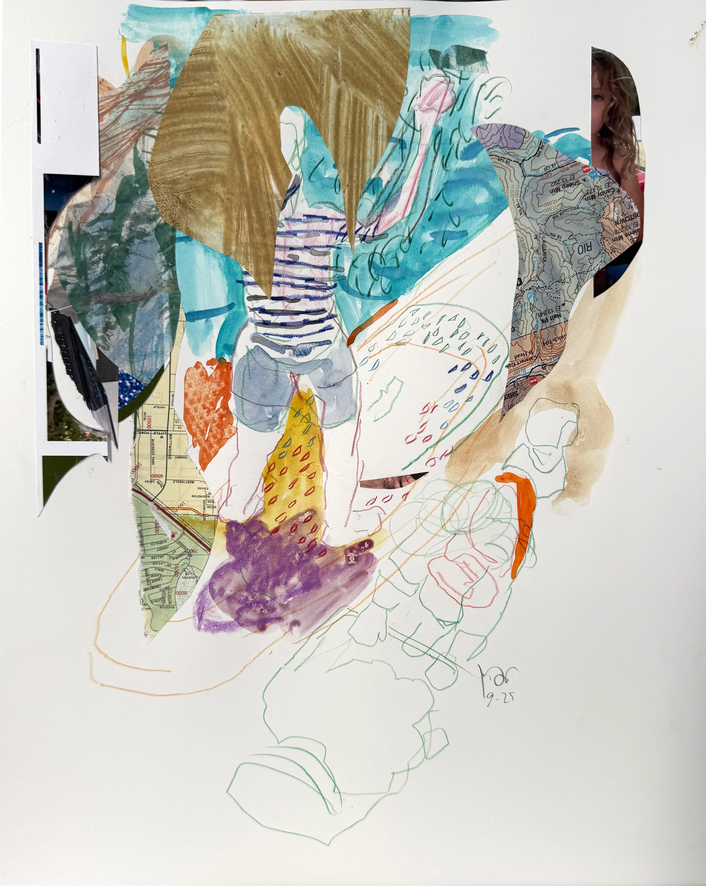 9/18/25 watercolor/collage, 11.25x14.25” watercolor, colored pencil & collage on bristol paper, day 1