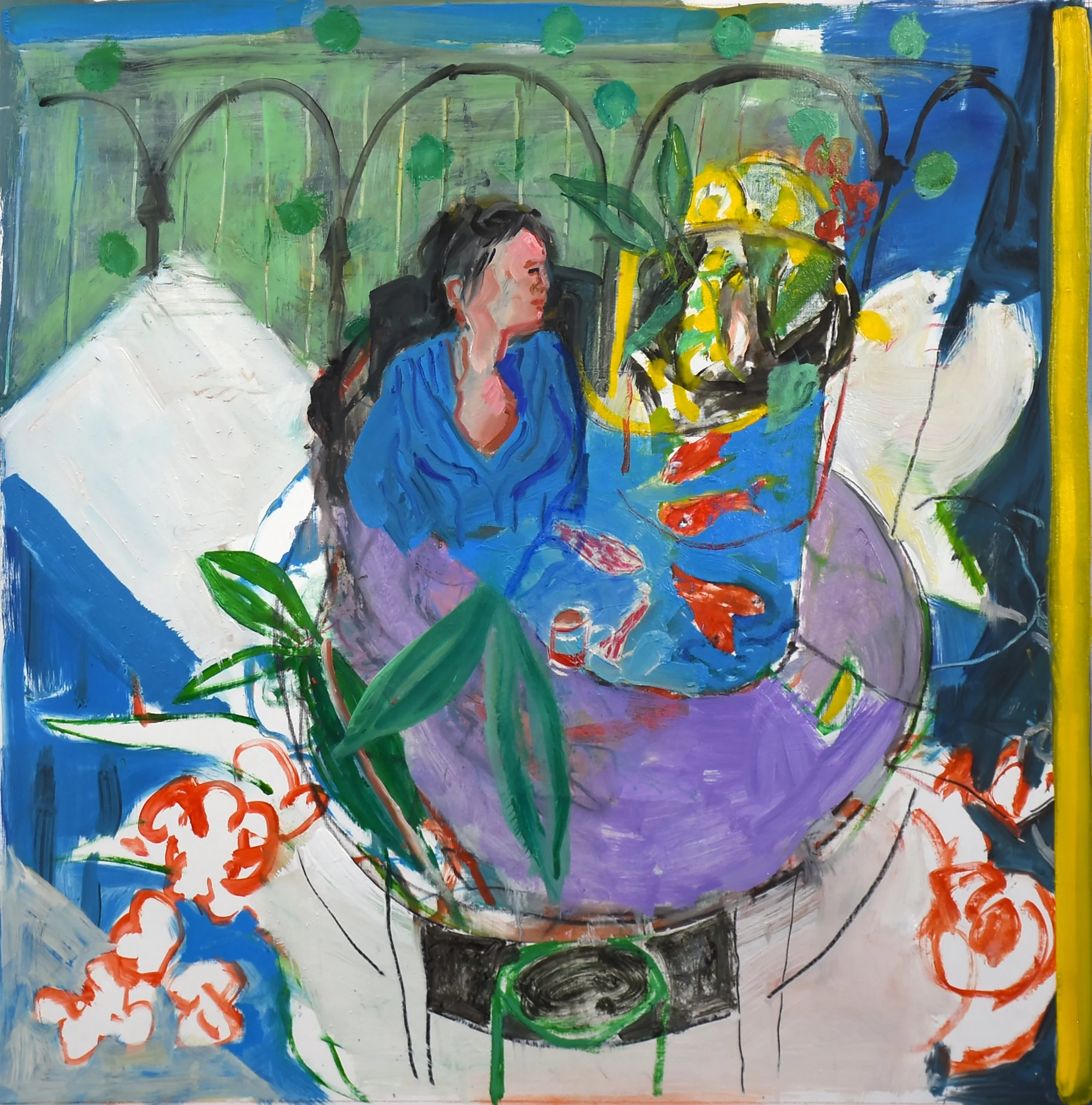 11:15 AM: i got a fairly early start this morning and continued work on 10/28/25 oil on portrait linen. this one has no figures thus far; the central image is a fish bowl, which is surrounded by leaves & flowers. although i’ve borrowed a bit from matisse, the composition and marks are signature tarlow. as i gaze at it now on my east wall, i think it’s the strongest of the four 28x28” oils i’ve made in the past couple of weeks. interestingly, one of the reasons for that is that the central figure with the watering can is absent, which allowed me to be freer with the composition as a whole.