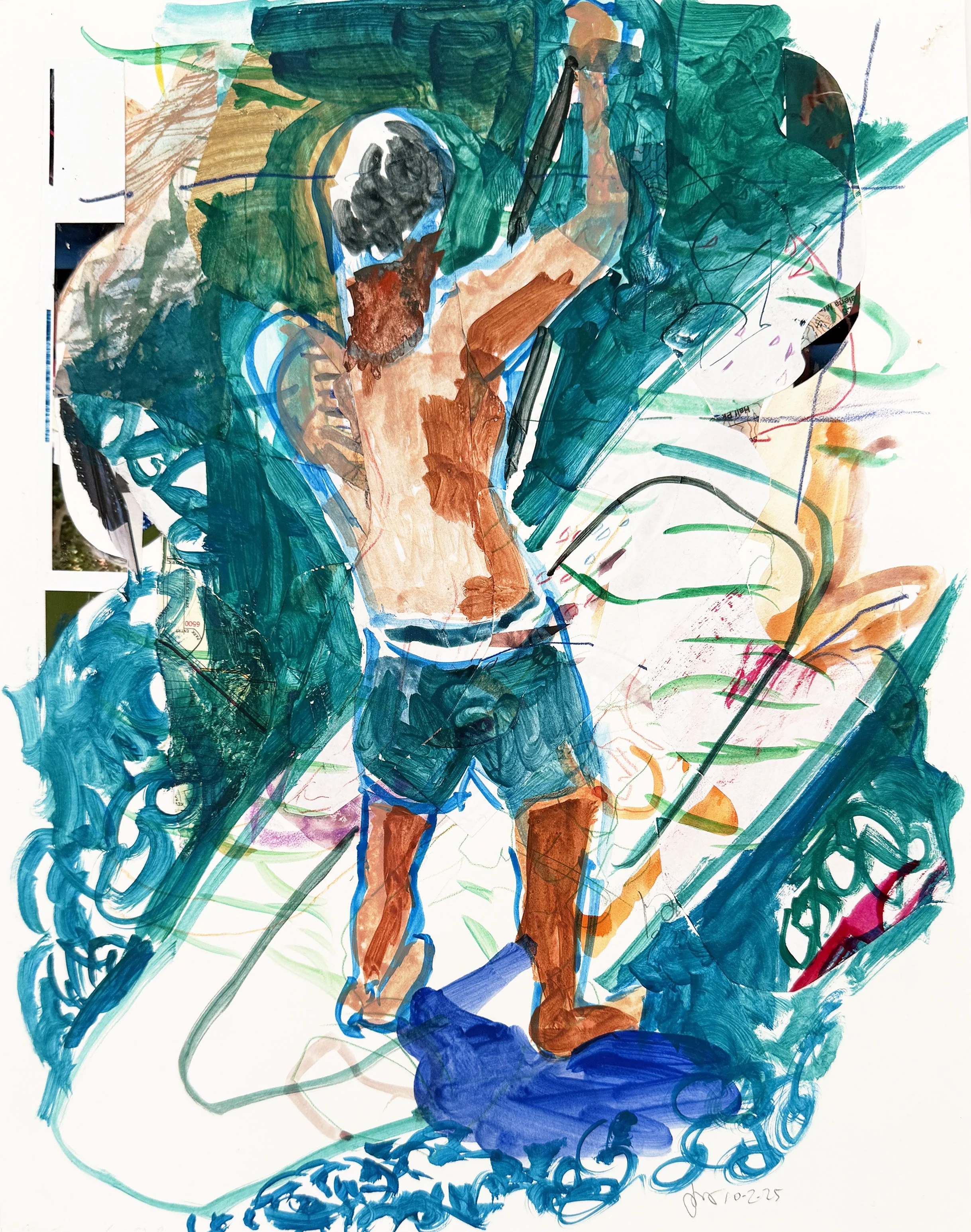 2:07 PM: this afternoon, i decided to panit over an older one. i can’t figure out which one it was, so it’s renamed 10/2/25 watercolor/collage. the main figure is one of the two paddlers i photographed last year from a bridge above the river in alamosa. it helps being familiar with the figure from previous paintings, so it’s a stronder presence than the figures that appear in recent watercolor/collages. so they may well be subject to revision as well in the coming days. my son dimitri and family will be here for another 2 days, which means i’ll likely be working after they leave the studio, where they visit in the morning and little filio makes her compositions using my watercolors and pieces of collaged weeds she gets from just outside the studio.
