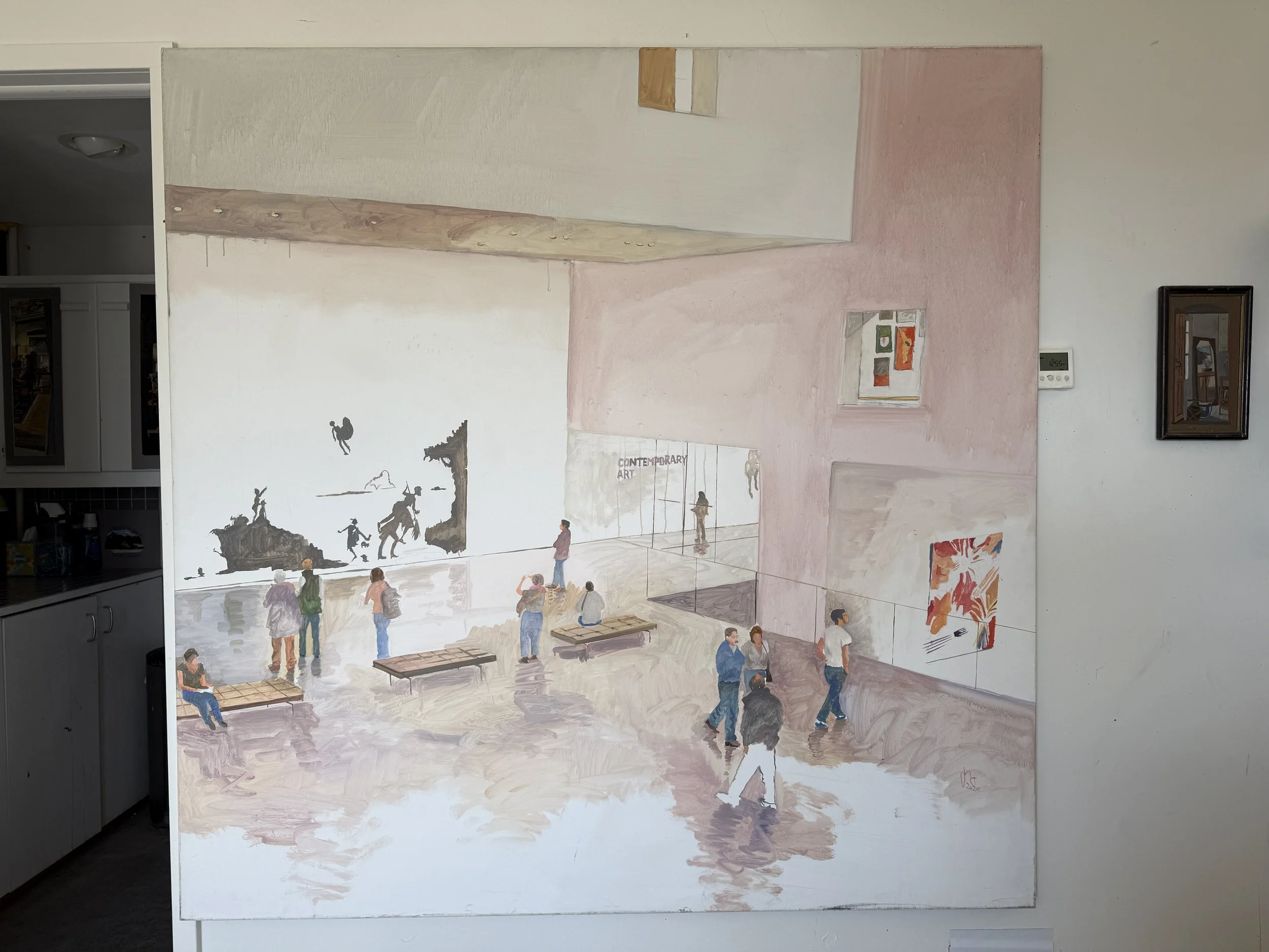 8:29 AM: in 2020 i made MOMA 1, a 60x60” oil on canvas inspired by photos i shot from above at the Museum of Modern Art in NYC. it was just hung on this South wall of my studio.