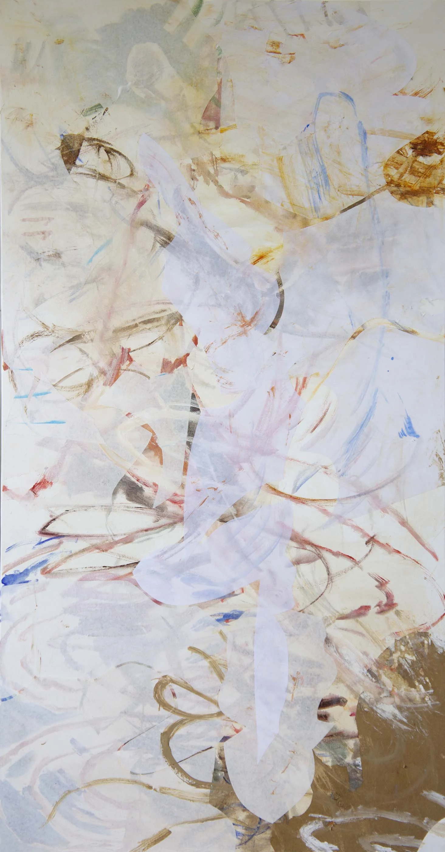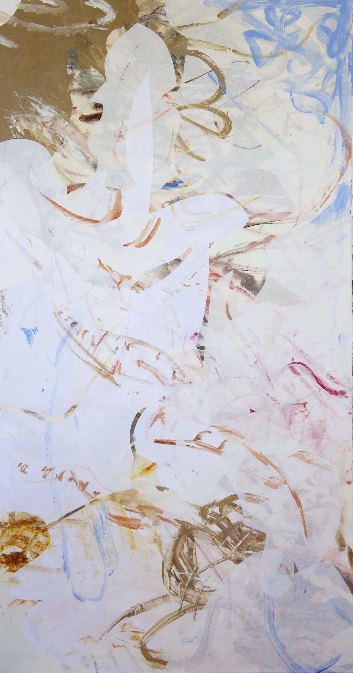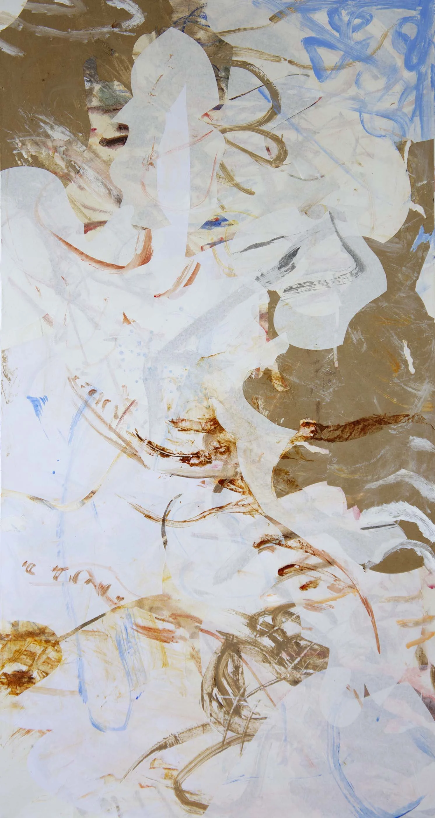as has occurred with other paintings in this series, the initial sketch has been worked over with acrylic and collaged paper. up is now down. strong graphic marks, like the branch-like element surrounded in green at the bottom of stage 1 remains, but upended and as a ghost image. hints of cascading water transition into biomorphic shapes, allowing the eye to move deliciously over the suggestive surface. calligraphic marks trail off and resume as tails, ears, branches or rocks.