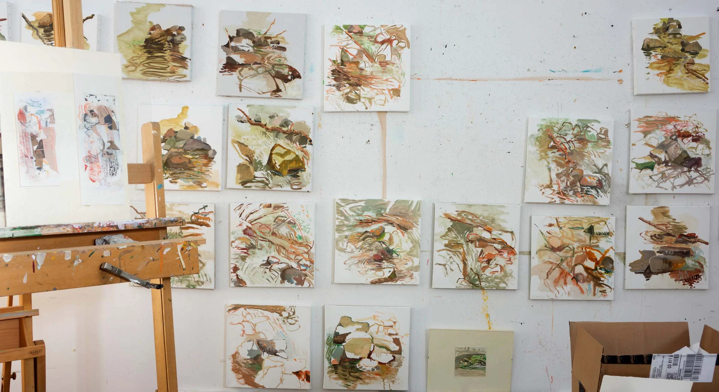 east studio wall with plain air paintings, january 27, 2014