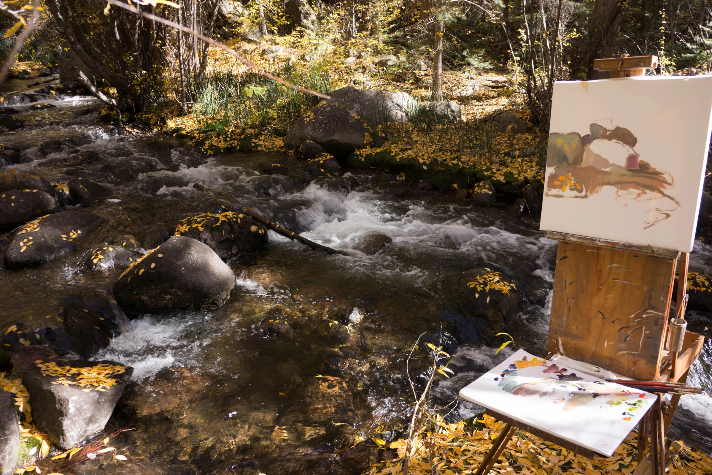 yesterday i went to the creek earlier than usual, about 1:30 pm. conditions were ideal and, in spite of the fact that while setting up i stepped in a big pool of water hidden by fallen leaves and soaked one foot, i was able to get a lot done in about 2 hours, which is longer than i usually spend on a plein air painting.