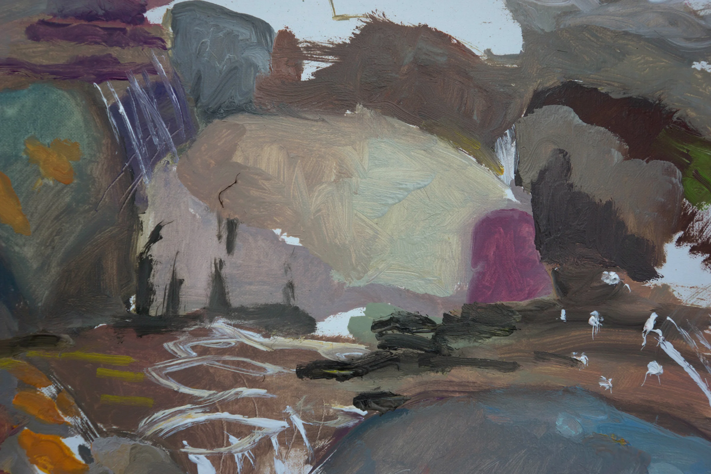 what's different, if you look at previous examples at plein air under the drop down menu works, is that the top 1/3 of the painting has no white space. this makes a significant difference, which i can see when looking at a wall full of recent plein air paintings. briefly, it allows the eye to focus on the main area of action, and makes the brush marks more important. i may go back today & we'll see what happens. in the mean time, i continue preparations for best left unsaid 9.