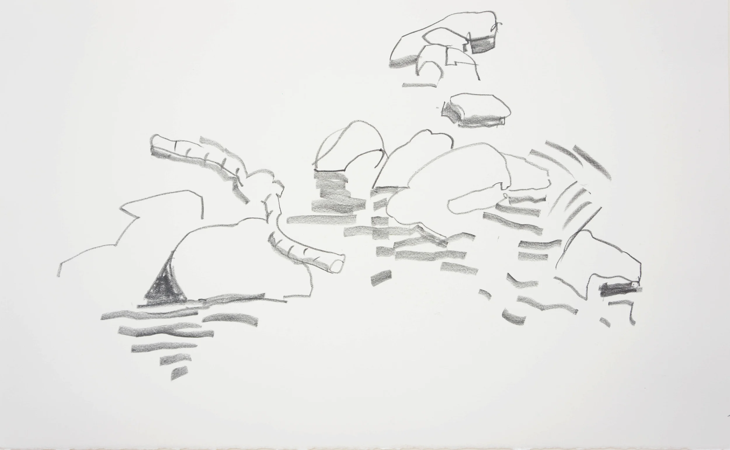 before i start the collaging process, the piece starts out as a drawing riff on my 16x16" plein air paintings, as you can see on the left.