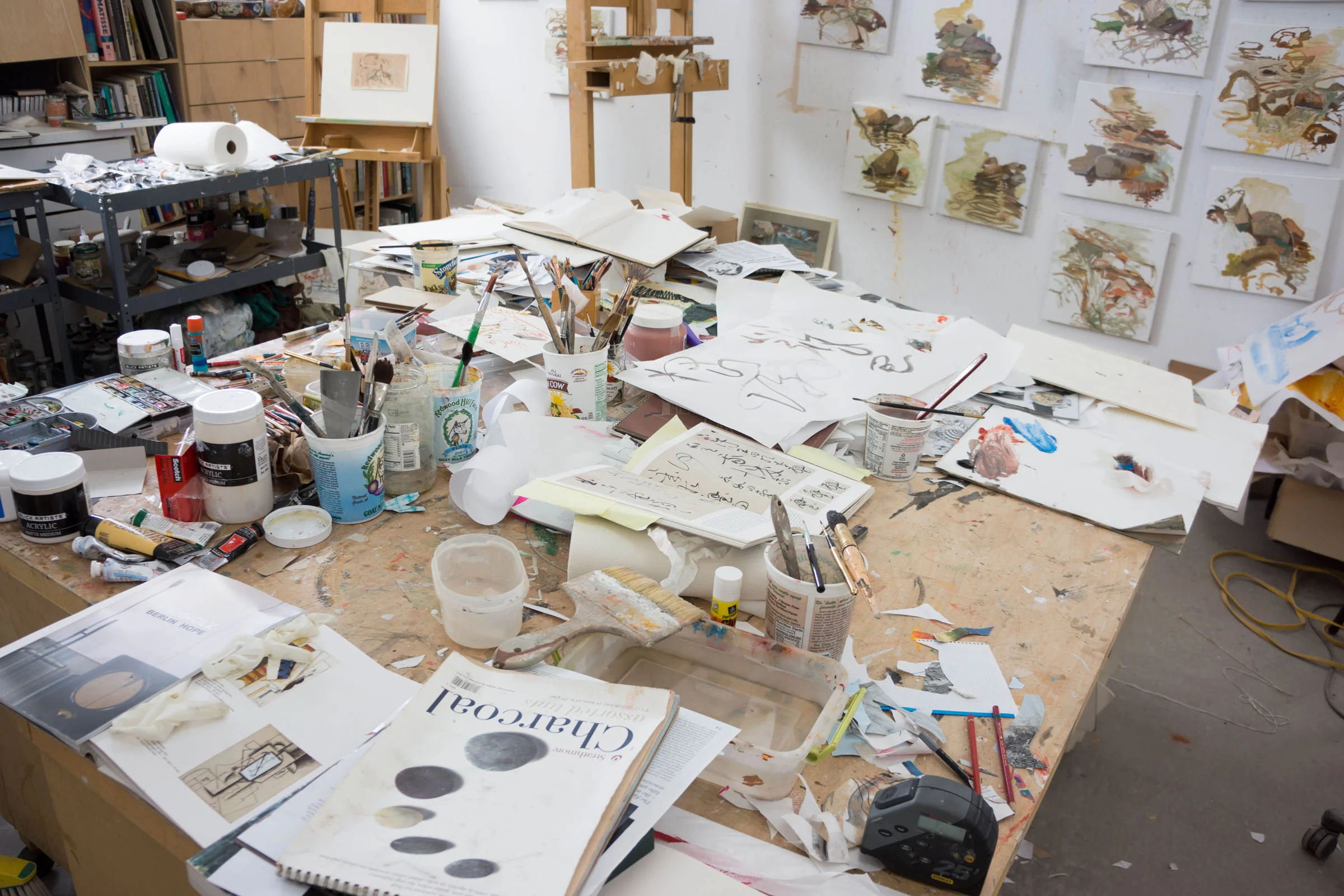 in the second row of images are two early stages of w.h. smith, showing once again how these collages almost always begin as a loose reinterpretation of my plein air paintings, which you can see in the background of the photo of my studio in the 3rd row, left. pieces of deconstructed calligraphic marks, as well as snippets from magazines, letters, etc. are then introduced in layers.