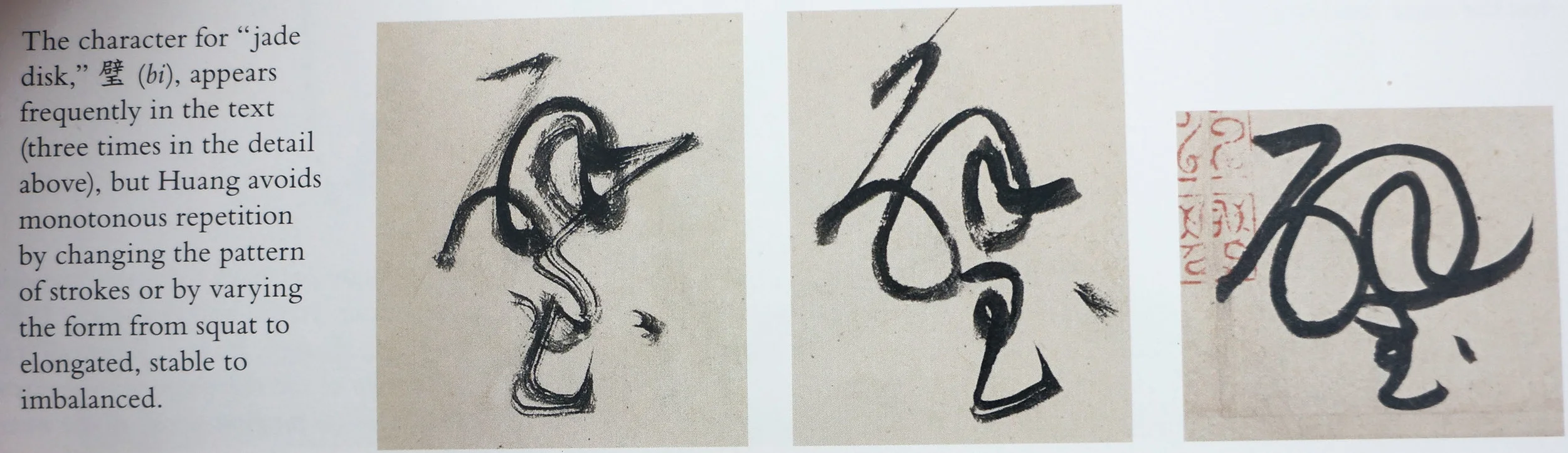 huang believed that calligraphy should be a spontaneous and expressive "picture of the mind." (maxwell k. hearn). this is not to say that huang worked with wild abandon, like the abstract expressionists. while cursive script appears to be written swiftly, the brush actually moves with great deliberation. but huang did "riff." when he was excited about a particular passage, he continued working without pausing to regularly reink his brush. when a character appears numerous times in a text, he avoids monotonous repetition by changing the pattern of strokes, so that the character looks quite different in each iteration. (see the image on the bottom row, taken from maxwell k. hearn's "how to read chinese paintings.")