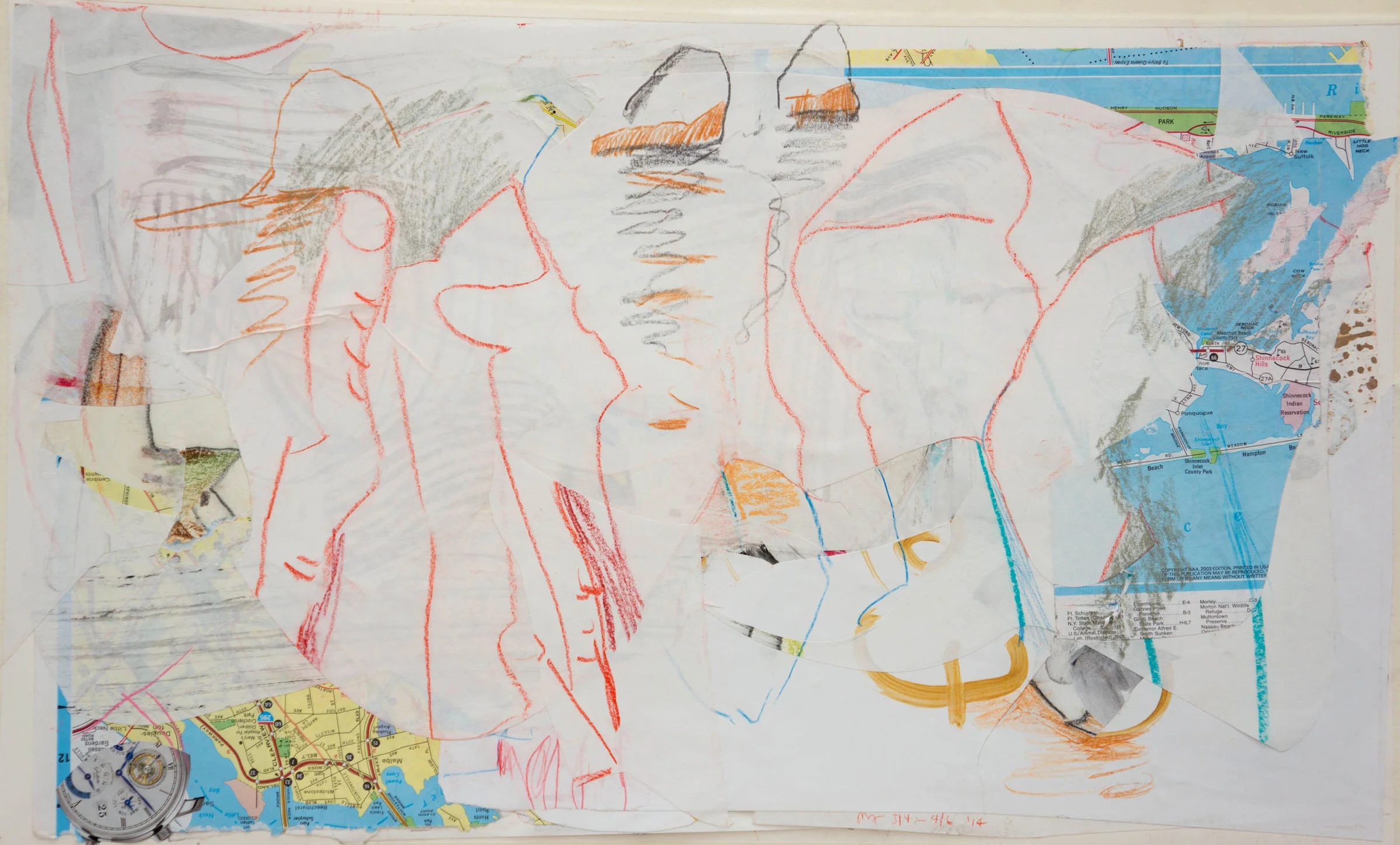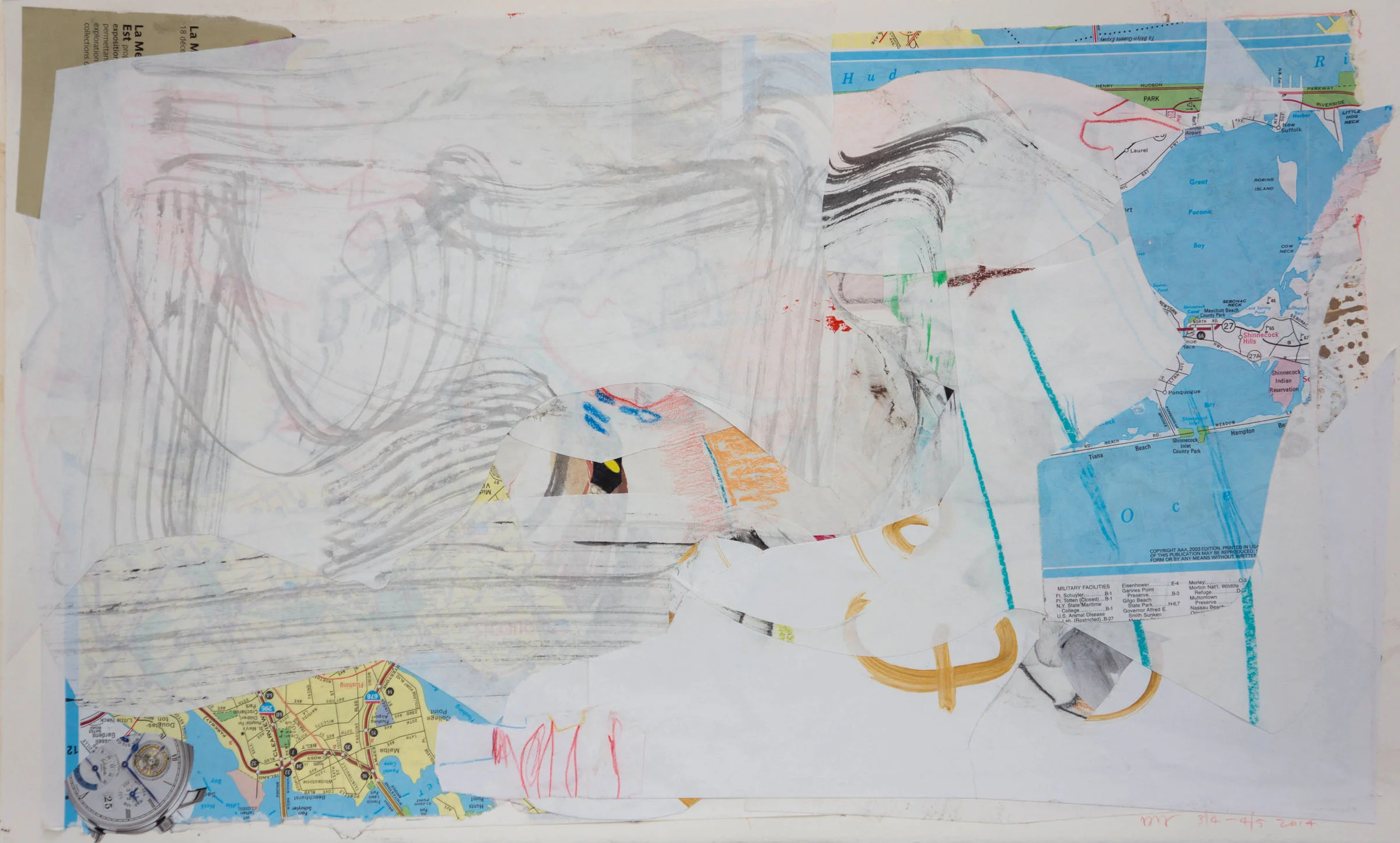 later: OK, so on the 2nd row are the before & after photos of gria cape and on the 3rd row, the before & after of glashutte. while gria cape got simpler & less cluttered, glashutte gained elements that enlivened a composition which, while it was very contemplative, was approaching the red line for BORING! It's not hard to see that I was working on these two at the same time i was creating the new 38x38" piece, weehawken. this new collage is very much in line with the direction the recent larger pieces have been taking: an underlying base note of riffs on huang's calligraphic marks on top of which collaged deconstructed drawings based on my north crestone creek paintings dance with map elements. in this case maps of the cycladic island of andros and a portion of the state of new jersey, which happens to include weehawken. i chose that as the title because the sound of that word reminds me of the energy of this collage, which brings to mind late dekooning as well as archille gorky.