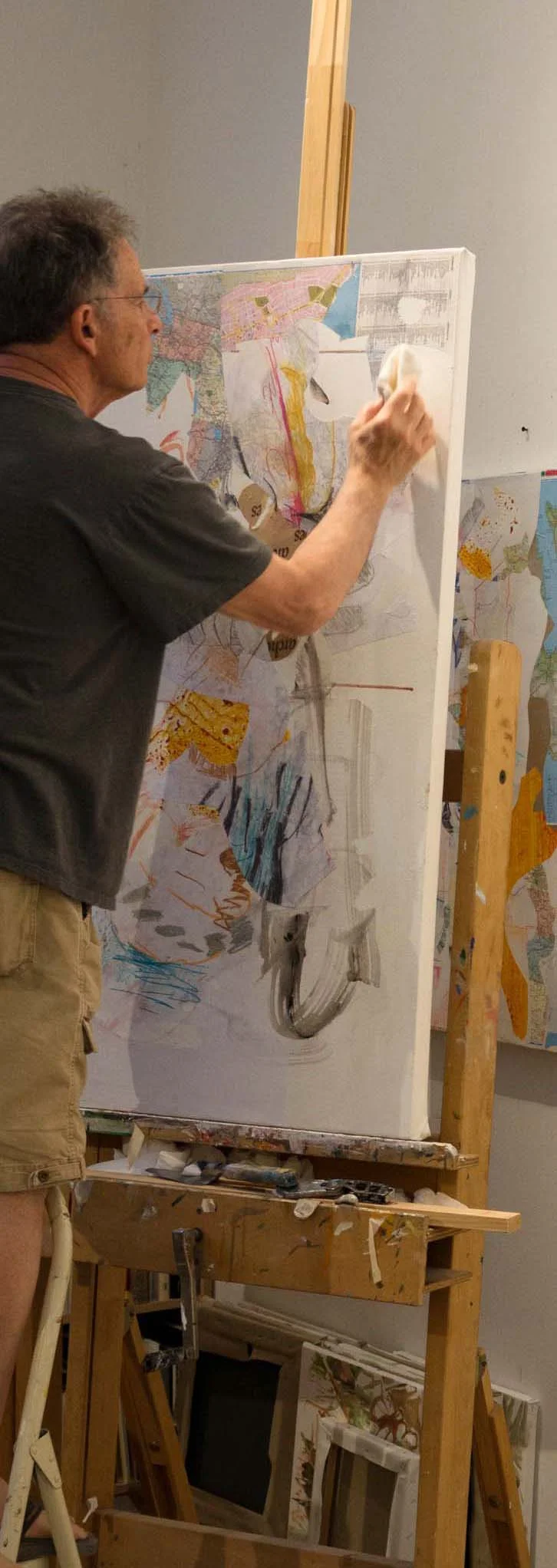 the piece began, (image on the left, below) as have many recently, with a riff on the calligraphy of my beloved 11th c. chinese master huang tingjian (below: 3rd row). next, studies in colored pencil and crayon, based upon my plein air paintings of north crestone creek, were made and cut into biomorphically shaped pieces. along with sections of maps and other scraps of paper, they were collaged over the calligraphy, allowing some of it to peek through.
