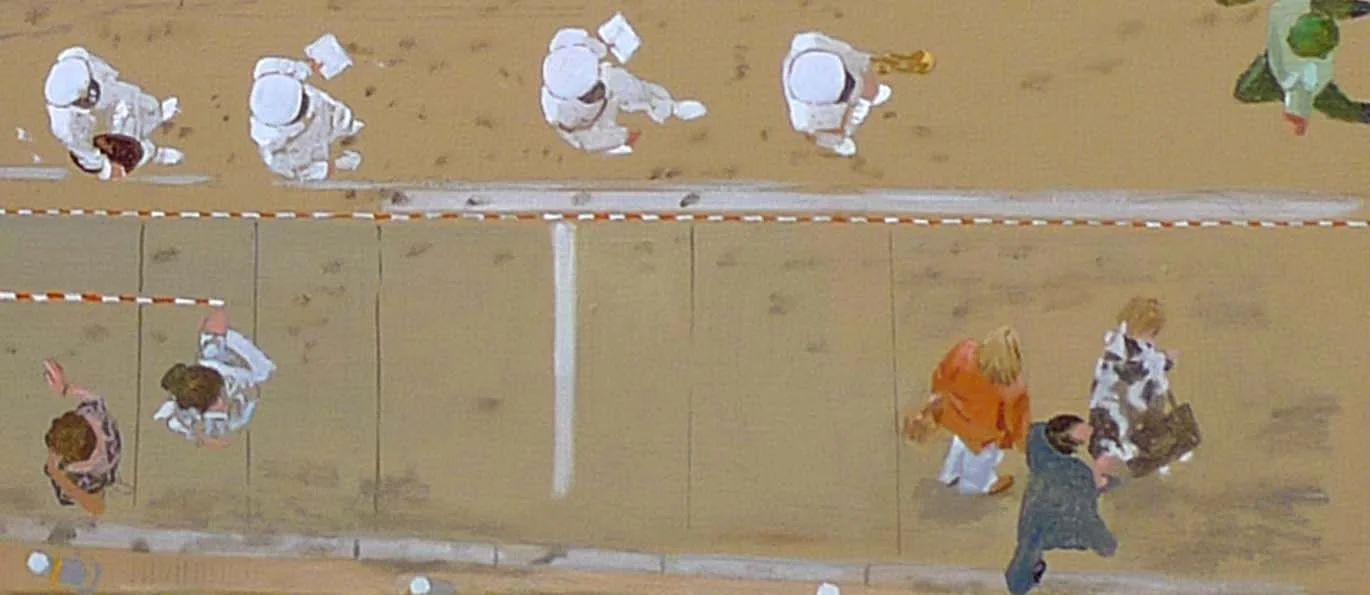 i am in the planning stage of 2 mini exhibitions, which will reflect both directions. one, titled chance encounters, will consist of recent collages along the lines of today's painting/collage. the second, titled everybody loves a parade, will consist of variations on the parade theme of the painting of the same title, which was a key part of my 2010 solo exhibition in athens, greece. a reproduction of parade, oil on linen, 38x30" is on row three, with a detail of the painting next to it.