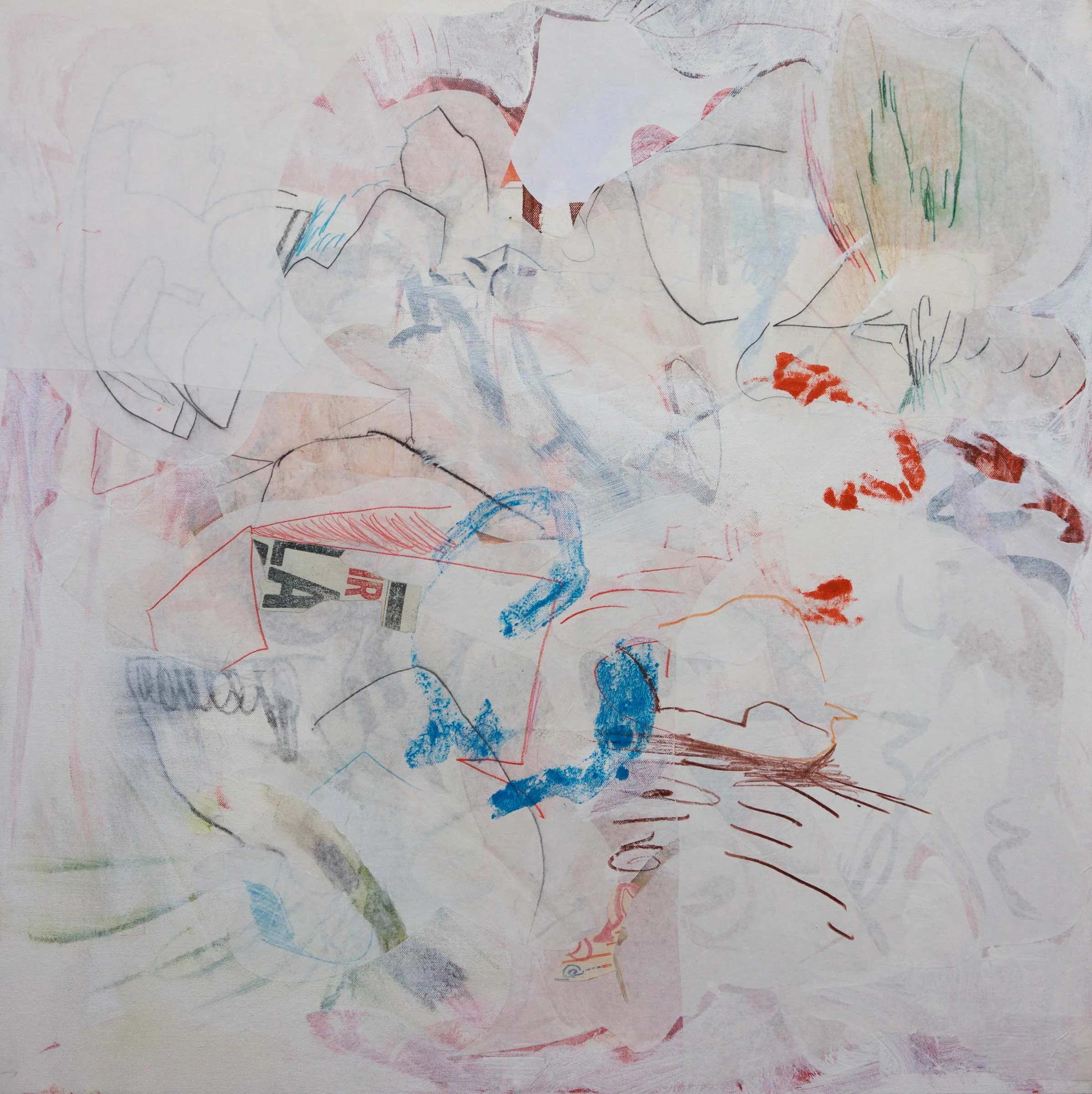 today's version involved making a series of brush and colored pencil marks on large sheets of paper, then cut into biomorphic shapes. the chance in chance encounter refers to how these elements are collaged onto the canvas, how they find their space in the dance. i try not to think about where each cutout needs to go; rather, in a white heat of energy that slices through plotting/planning/calculating mind, they go where my hands place them. you trust unconscious mind to do what conscious mind cannot.