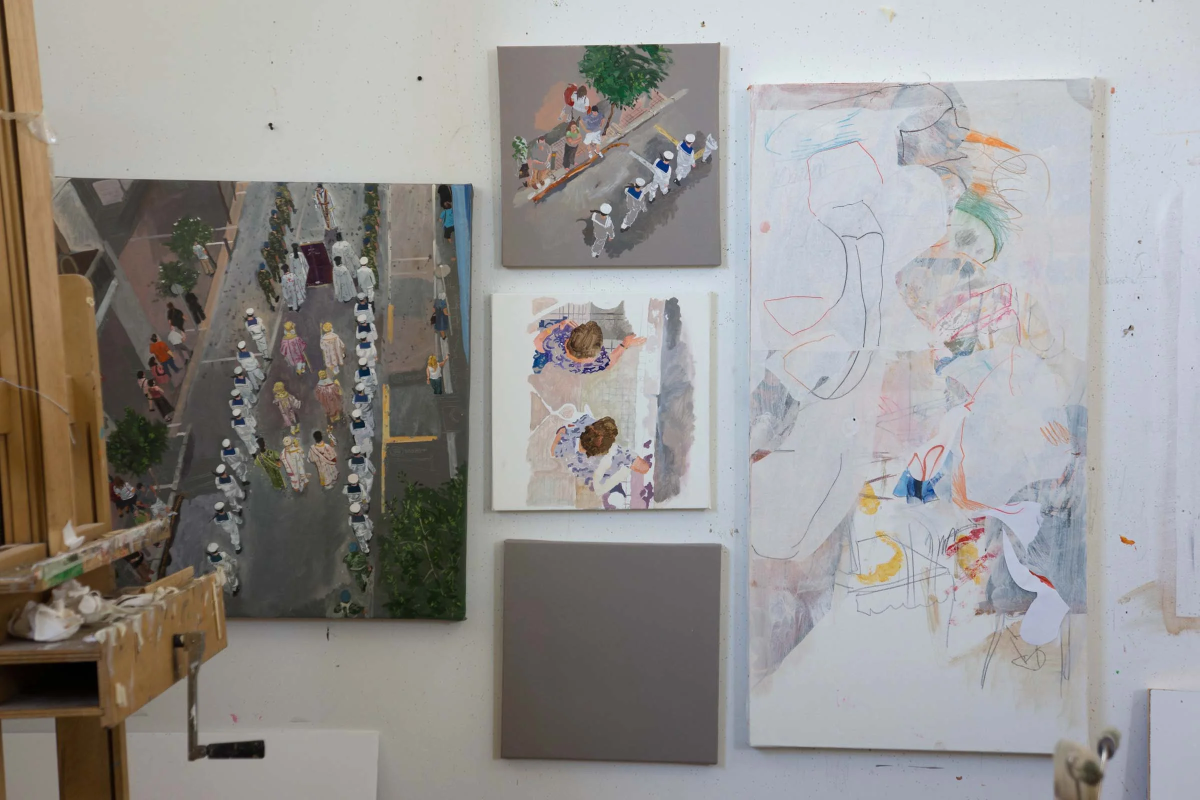 below, 3rd row right: the ne corner of my studio, with best left unsaid 1, 2 and 3 next to the recent collage, chance encounter II, 48x24".