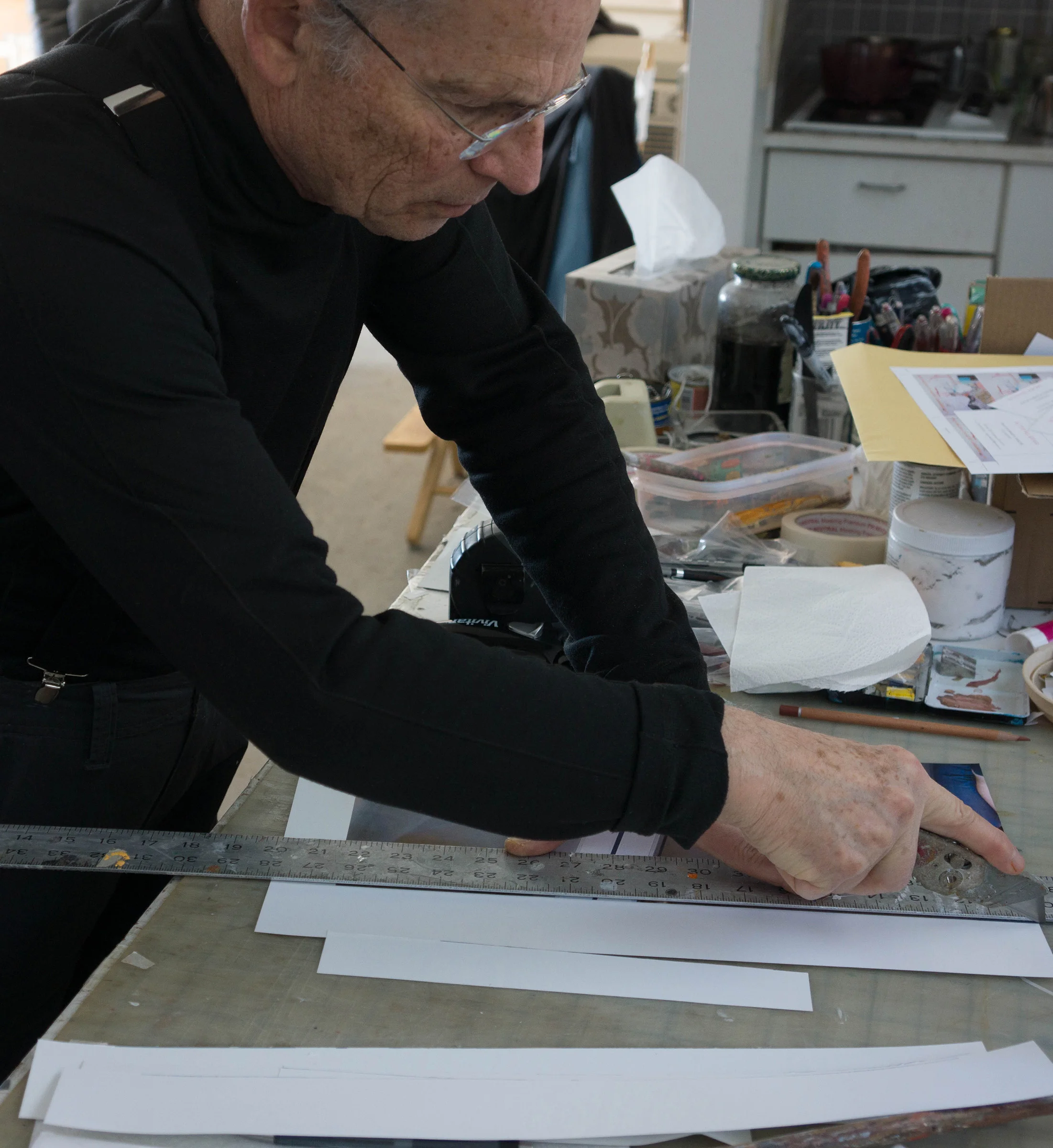 2:29PM update: cutting the freshly printed image and preparing to trace the drawing. 2nd row right: an Artfix sample book of the Artfix L64U linen, with some test brushstrokes showing the extreme sensitivity of this exceptional, quadruple primed linen. i had been using the lighter weight L84U for the 16x16" canvases, but i needed a heavier weight for the larger versions. the sensitivity of the surface is the same however.