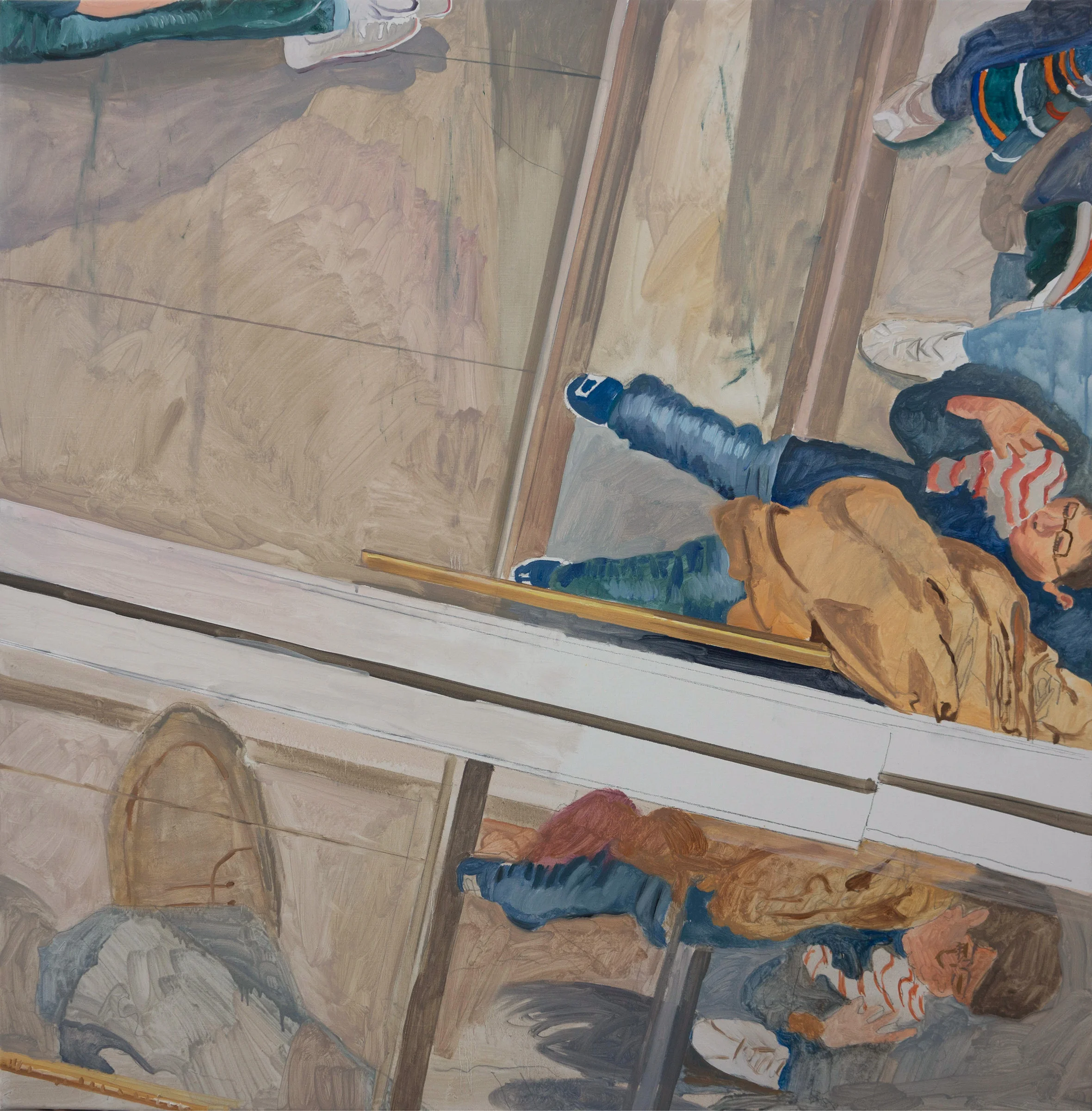 12:49PM UPDATE: after making the adjustments & tweaks i spoke of yesterday, below is the completed, signed parade 22. if you compare it with yesterday's version, on row 2, you will see what a huge difference the final tweaks on a painting can make. now that the bottom half, which is a reflection in glass, was "pushed back" by waiting for it to dry enough overnight that i could lightly brush over it with a very diluted grey-ish, pinkish color, the painting has come to life. the eye travels over the surface smoothly, without getting stuck anywhere. of course that's a simplification of what really happened. if you compare the upper left quadrant, you'll begin to notice in the light & shadow on the floor, for example.