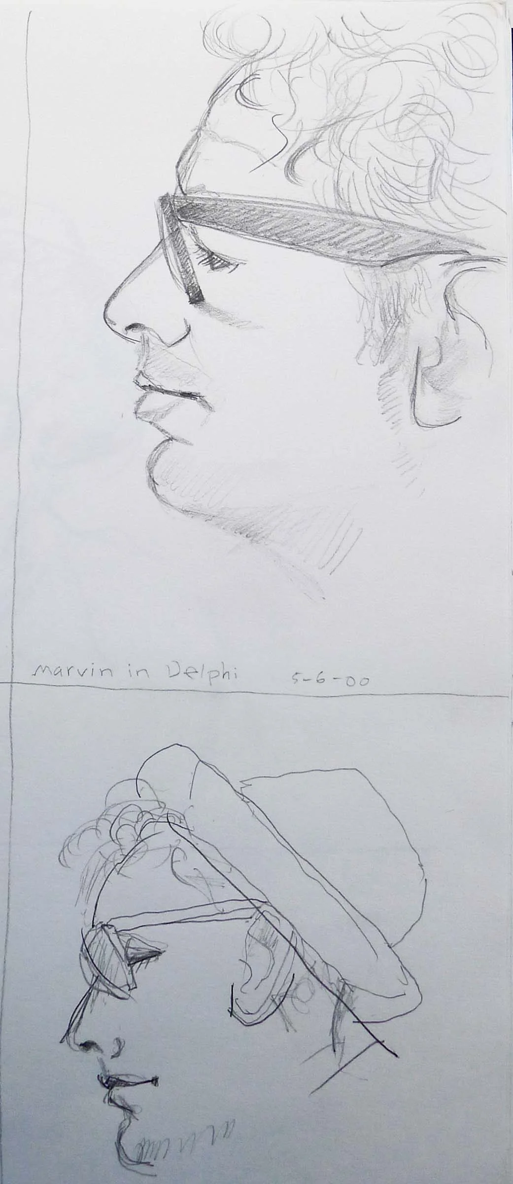drawing in pencil of L.A. musician marvin etzioni, done in 2000 in delphi, greece