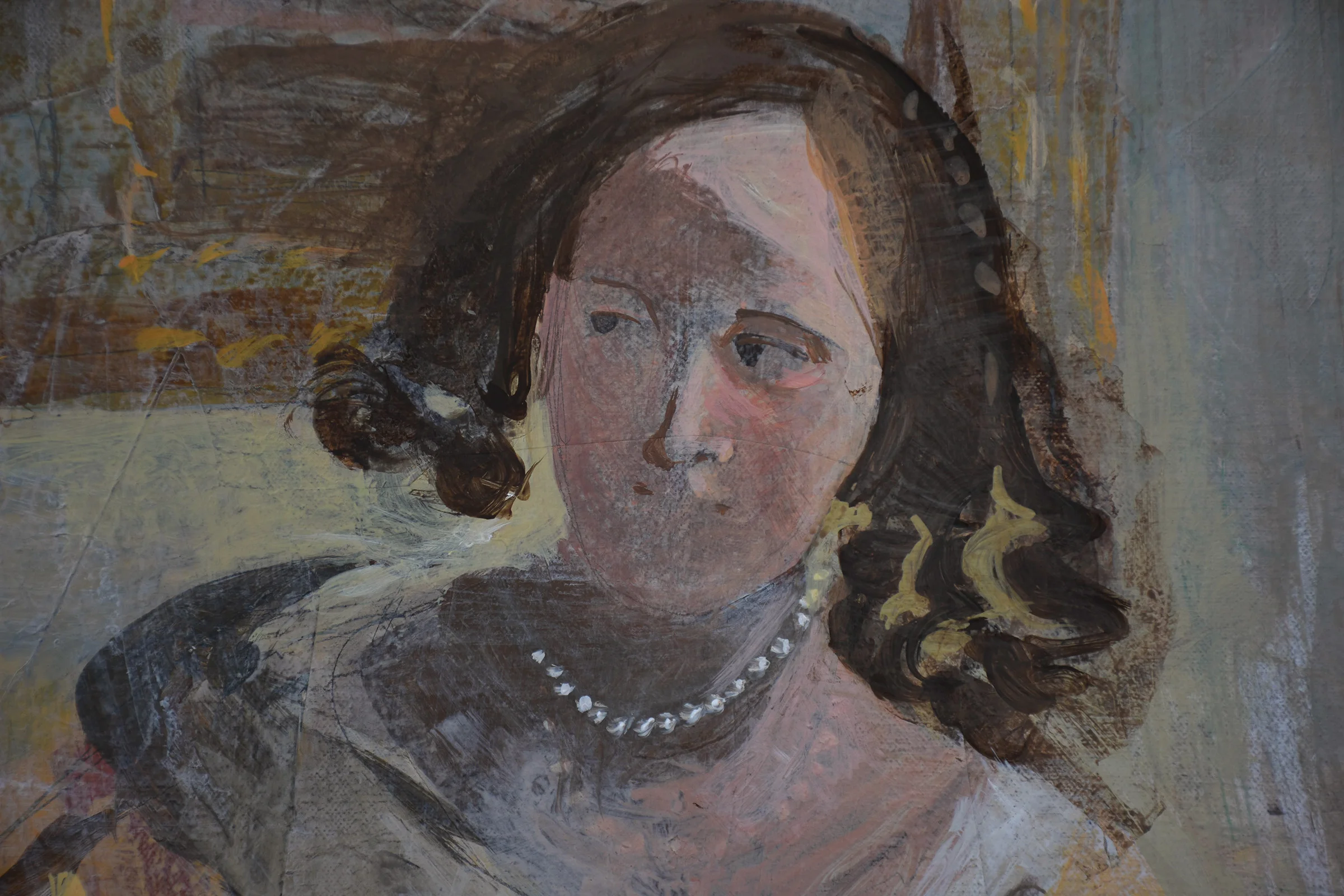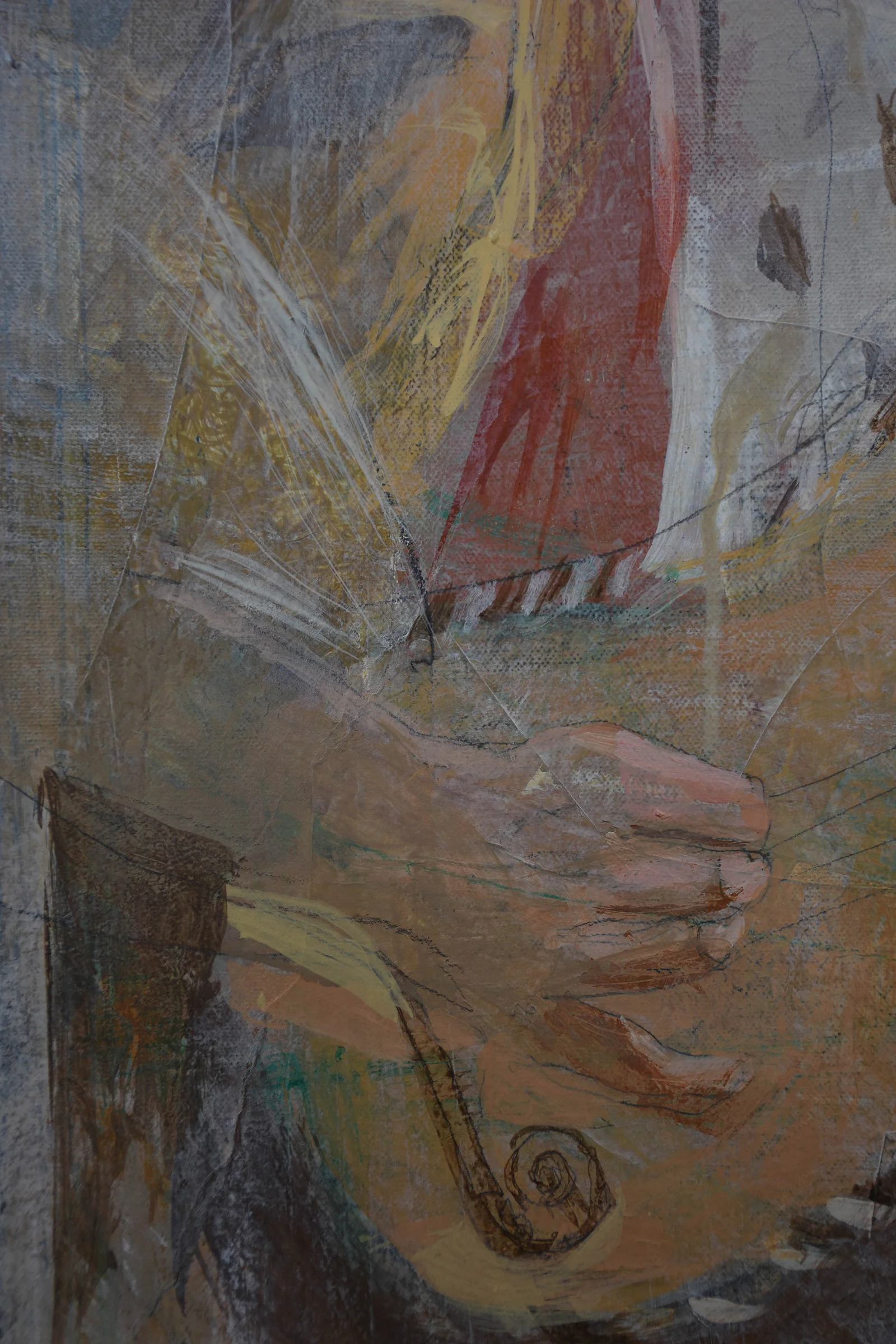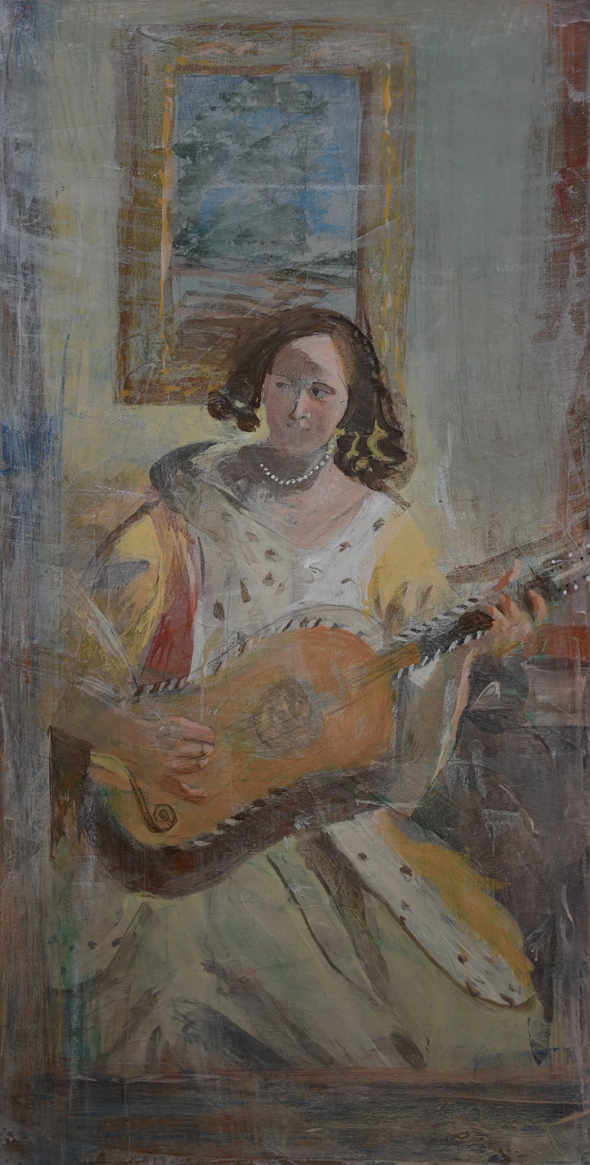 2:26 pm: yep. the saga of grey 2/the guitar player continues. after more critical (and loving) gazing over at the house, i saw that i had overdone it with lightening and simplifying, especially on the face and locks of hair, but on her right hand as well. so i am doing the rough equivalent of brain surgery. but imagine the surgeon wanted to create the most elegantly beautiful result, as well as healing the patient. please excuse me, brain surgeons!