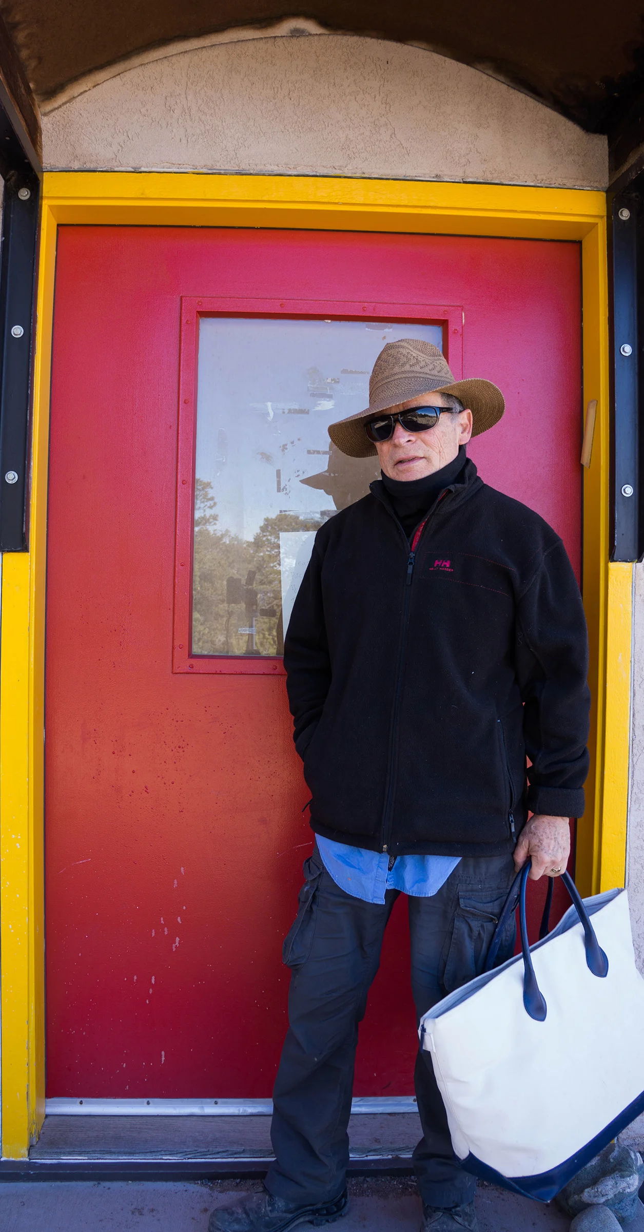 below a shot of the studio before starting work this morning, some of the books i look at most, and me standing in front of my studio door in my new hat, purchased yesterday in salida, where we had gone for a doctors appointment. here in crestone, at 8,000 feet, the UV rays are intense, and i needed a big brimmed hat to protect me when we take our walks. it's very soft & flexible; ideal for travel.