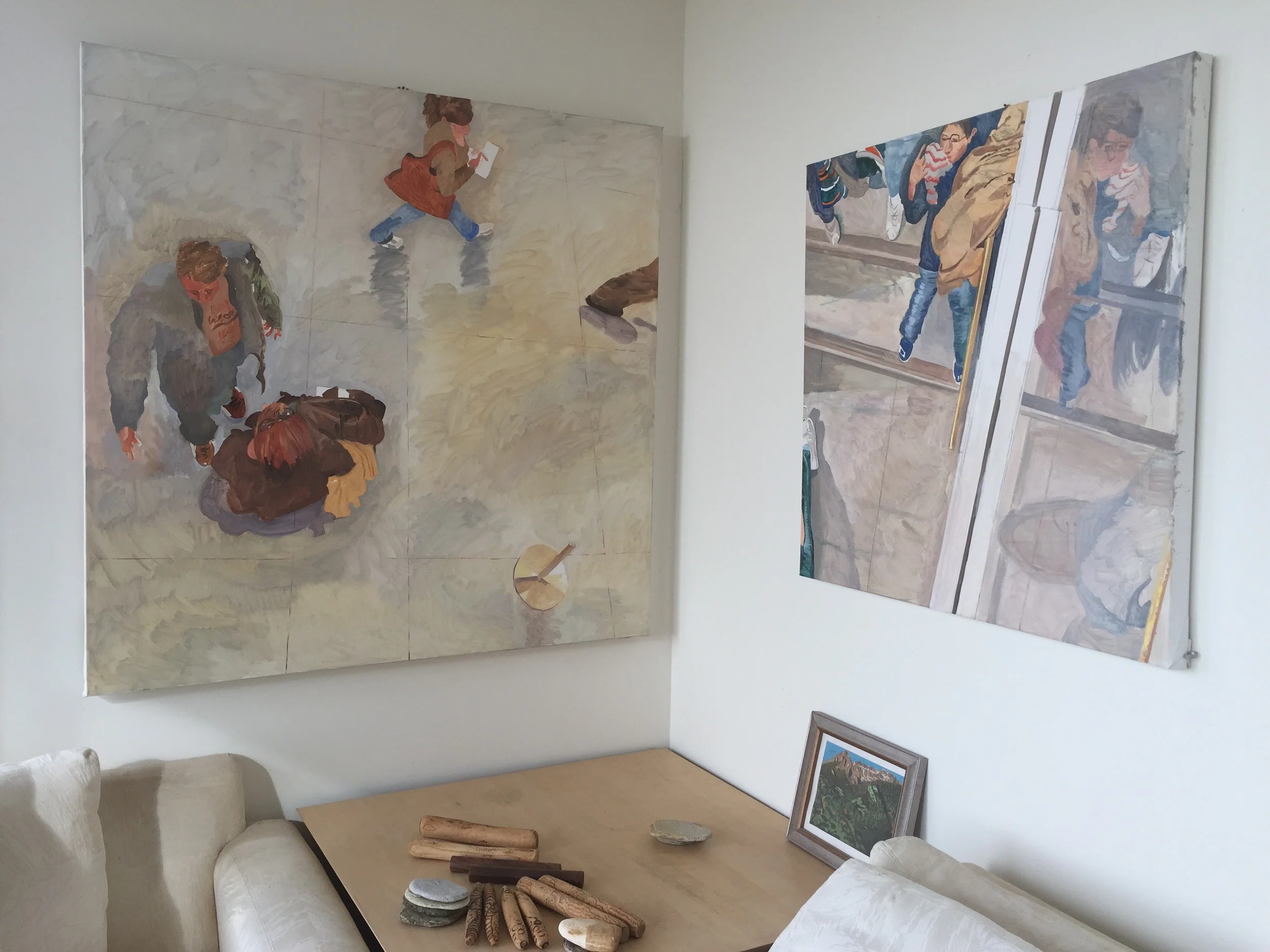 9:49 update: BELOW- a photo taken recently of the completed parade 22 and parade 24 hanging in our west living room. the first group of completed parade paintings will ship to houston sometime in the next month to be cataloged and shown to clients during the period leading up my solo show in november.