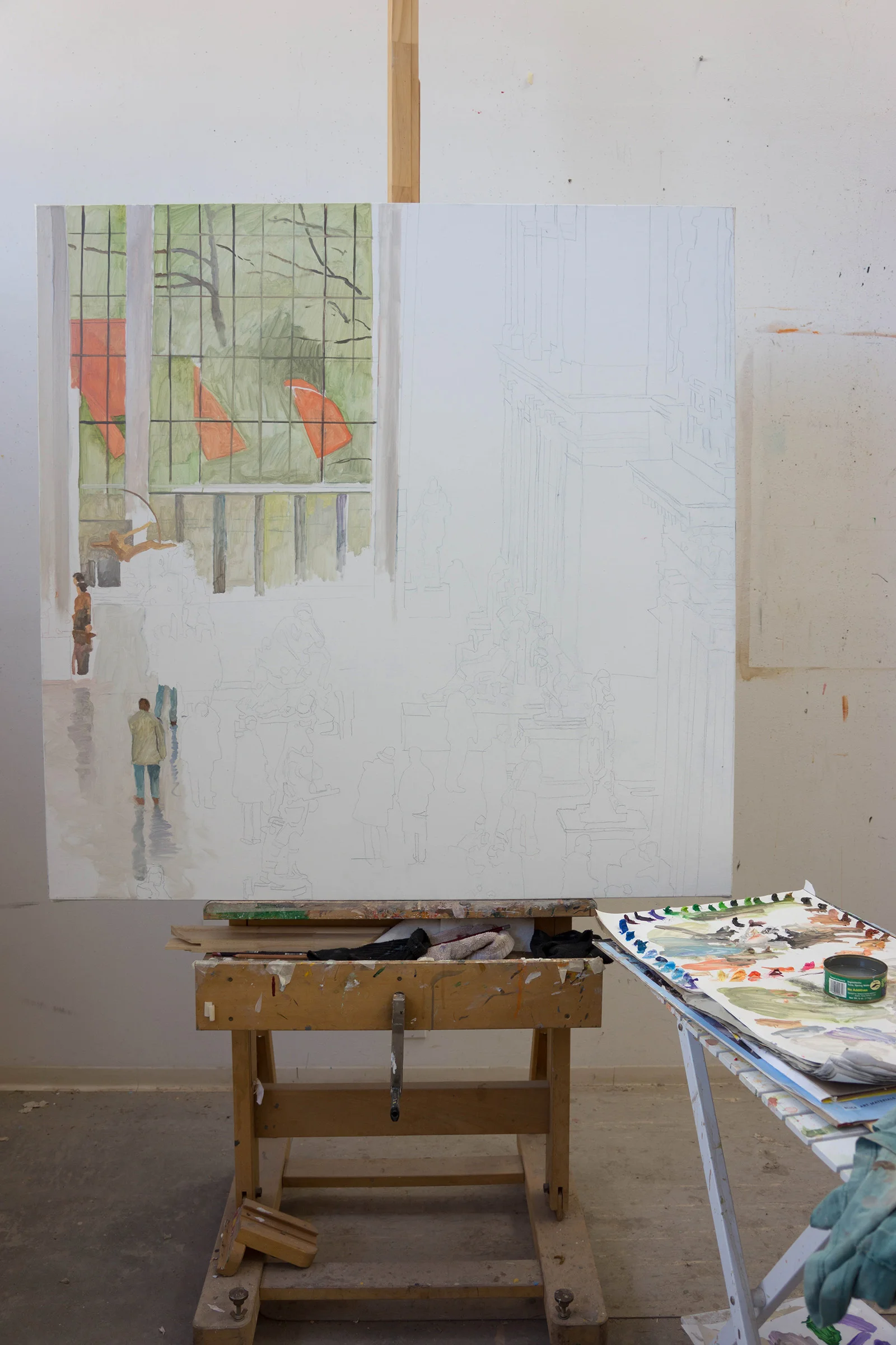 it's good, but it needs something that will make it pop. i don't know yet what that is, but then again i never do. it's a kinesthetic experience that happens once i squeeze out my colors and pick up my brushes. it's always important to keep reminding myself "this is NOT the METROPOLITAN MUSEUM!" this ia a series of marks on a two dimensional surface. what makes it "work" is not whether or not it brings to mind the MET. what DOES make it work.....well that's another whole story, and right now we need to get on the road.