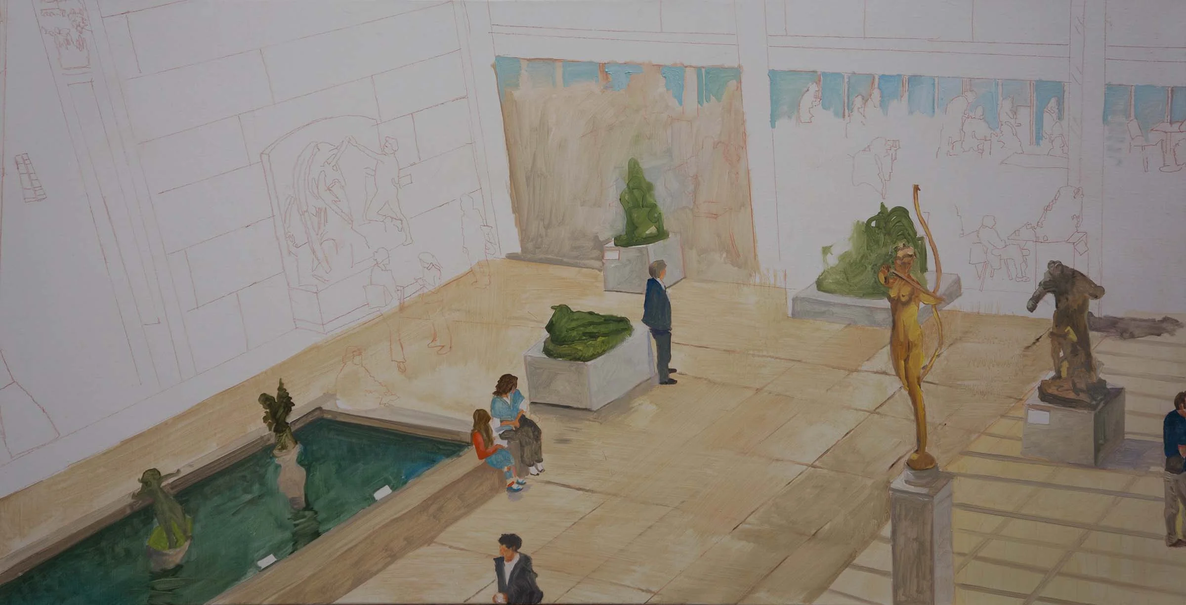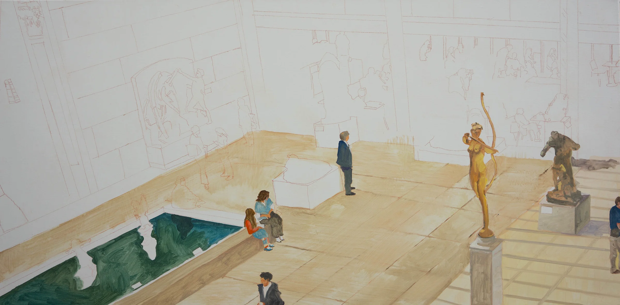 3:43 pm update: i was correct in saying earlier today that this would be a pivotal day for parade 28. if you take a look at earlier versions, you may notice that the space has now snapped into place. the mood; the tone has been set. each painting in this entire series has an air of mystery and silence. when figures are gathered for an express purpose in a space devoted to great art of the centuries, there is about the space an almost religious quality of silence and awe. the feeling would be quite different if this were the lobby of some corporate headquarters, for example. my predilection for figures that pose as many questions as they answer, noted years ago by the late n.y. times reviewer john russell continues unabated.