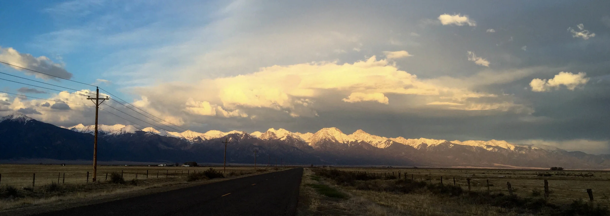 7:15 pm: 16 miles from crestone. in the distance on far right: the great sand dunes national park. crestone is directly below the flat snow capped peak in the center