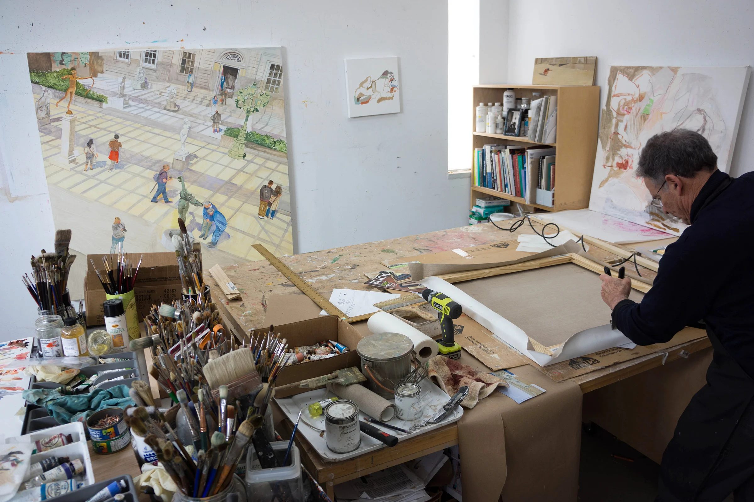 2:40pm update: the storm has arrived, and i couldn't have chosen a better day to stretch canvas. it's so dark, i wouldn't have had enough light to paint.so i did complete stretching the 32x32" canvas for parade 33: the final in this first grouping of parade 1 through 14, using the first roll of portrait linen. i just ordered a second roll, which should arrive within a week.