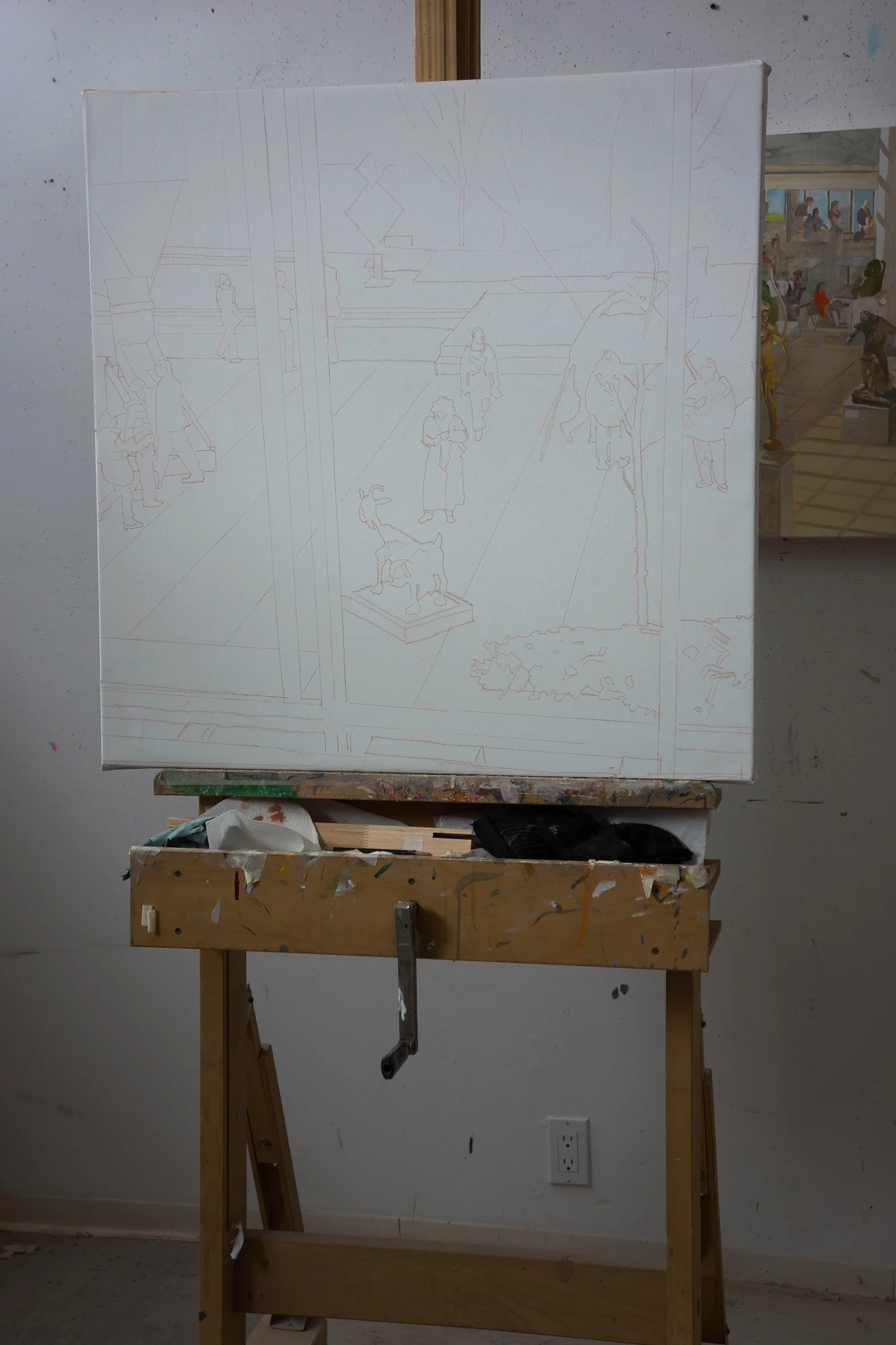 BELOW: the drawing for parade 33, based on a series of photos shot in the MOMA sculpture garden eight or nine years ago. in the center of the image is picasso's goat sculpture.