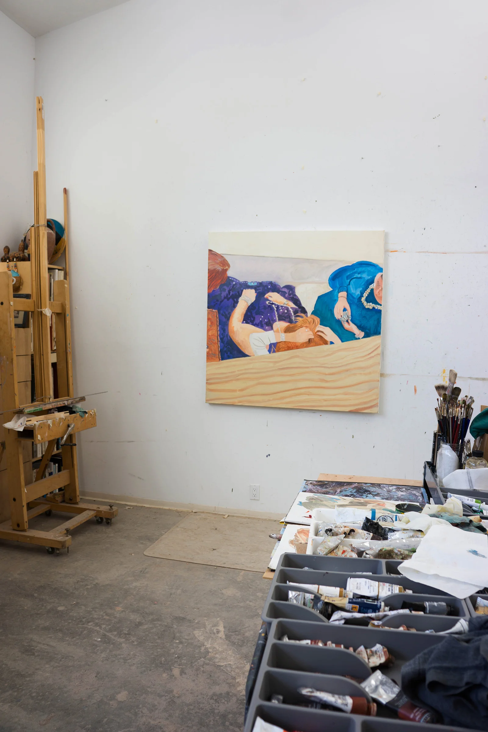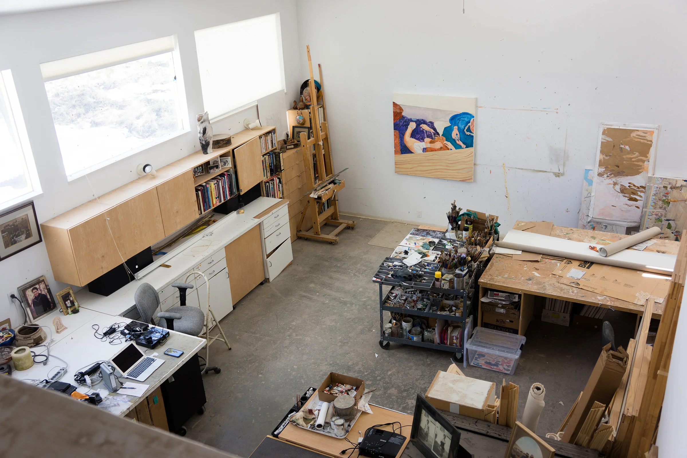 parade 37 seems resolved. i'll know as the days progress. but, for now, i'm declaring it complete. here are some photos, appropriately shot from above, of my studio as it appears this morning, with parade 37 hanging on my east wall.