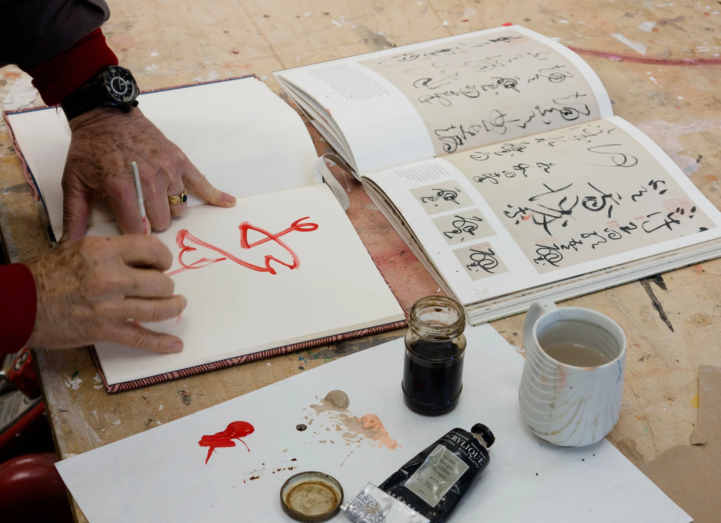 this is the second day in a row i didn't sleep well, so i fell asleep twice during my meditation. upon entering my studio at about 10, i went straight for my drawing books and calligraphy brushes. somehow, i remembered my daily warm-up exercises, where i make gestural marks in one of my drawing books while looking at reproductions of huang tingjian's 10th c. calligraphy. these sheets of exercises will eventually be cut up and used in my collages.