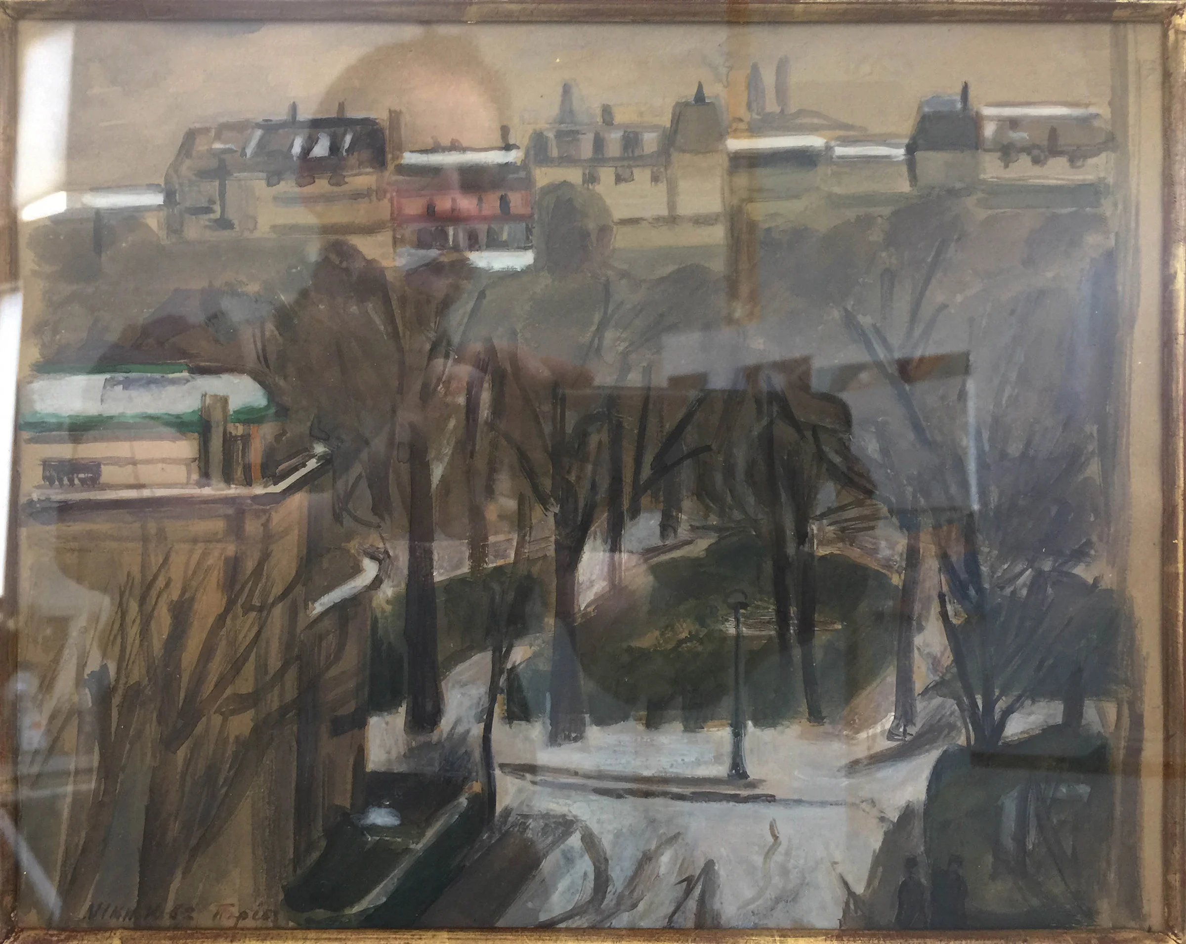 and, before getting back to work, i wanted to remember my former mother-in-law, the late niki karagatsi, an extraordinary artist and human being. as you will read if you go to my story page, she and i were very close, and i learned a lot from her as a painter. aside from a few beautiful drawings, this is the only painting i have of hers, in gouache on paper, painted in paris in 1962. she had gone there so she could have a medical procedure. i couldn't avoid reflections in the glass, but it's appropriate that my reflection is present.