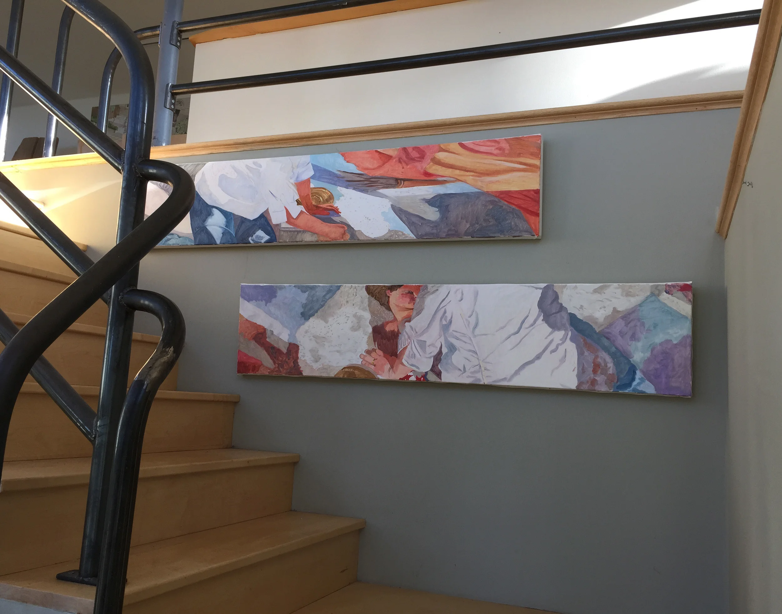 8AM update: at about 10 i'll go to the studio and continue work on parade 41. here are parade 30 and 40 hanging together on our stairs. and here's a detail of parade 35, which is 60"x60" and hangs in our west living room.