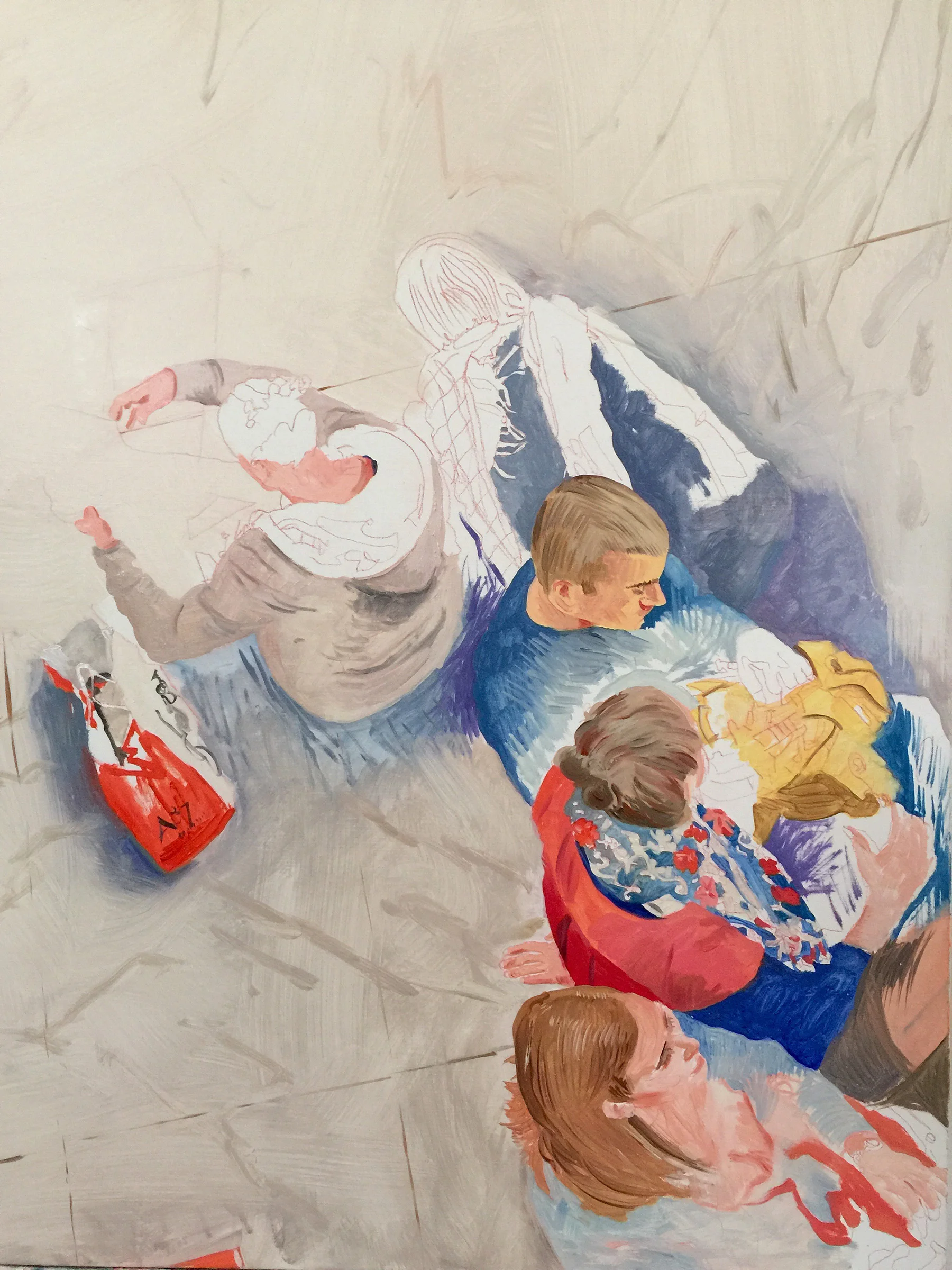 6:59 pm update: i did do a bit more work on parade 41 before leaving the studio, and shot a detail of the final version with my iphone before leaving, which you see BELOW. So what's DIFFERENT about this one from previous parade paintings? if you compare it, by going to the parade page, you will that i've learned from what came before. take the male figure with the blue shirt, for example. the blue of his shirt begins breaking up, until it moves from a solid color to parallel brush marks. so, you ask? so there is, for starters, a tip of the hat to van gogh. gotta go out; more later.