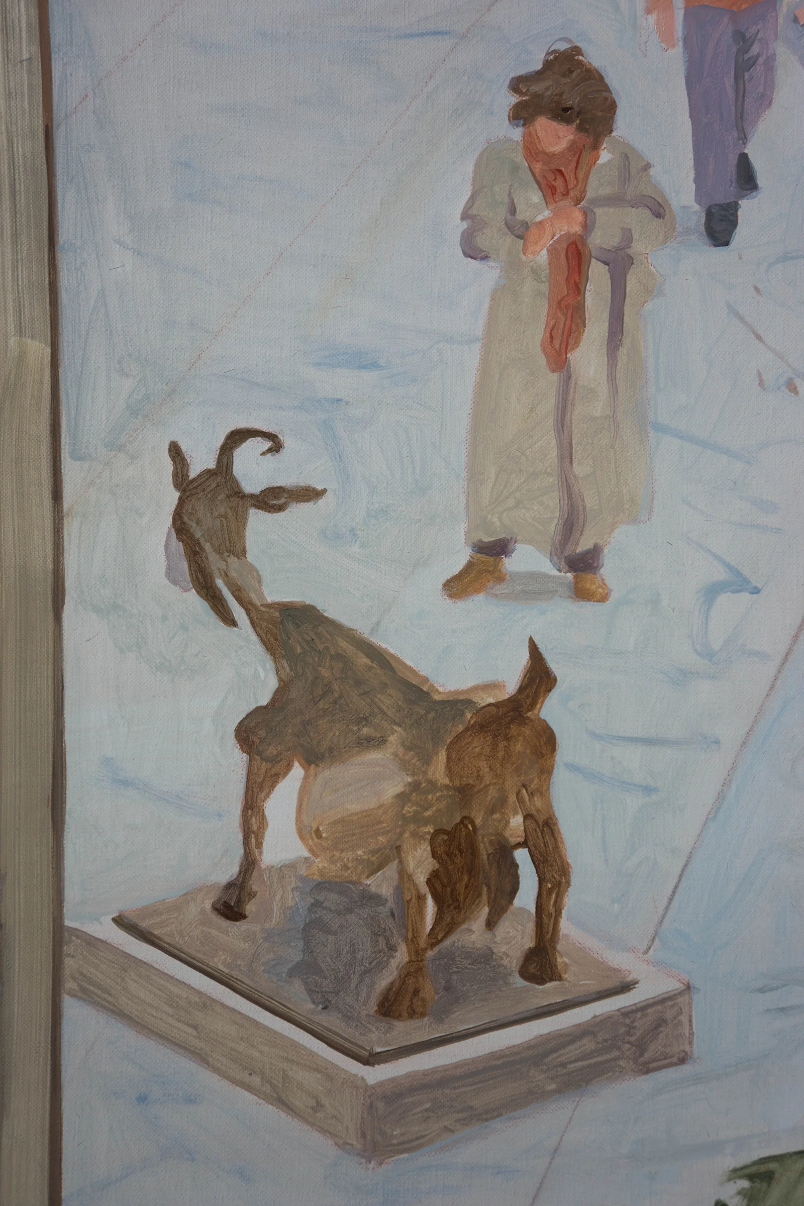LEFT: it was with trepidation that i began re-working picasso's goat, as he was so beautifully painted. it had to happen though, to keep up with other changes in the painting that made him look pale and timid. no timidity here! this is a picasso goat. vigorous. sexually aroused. a vital m-f goat!