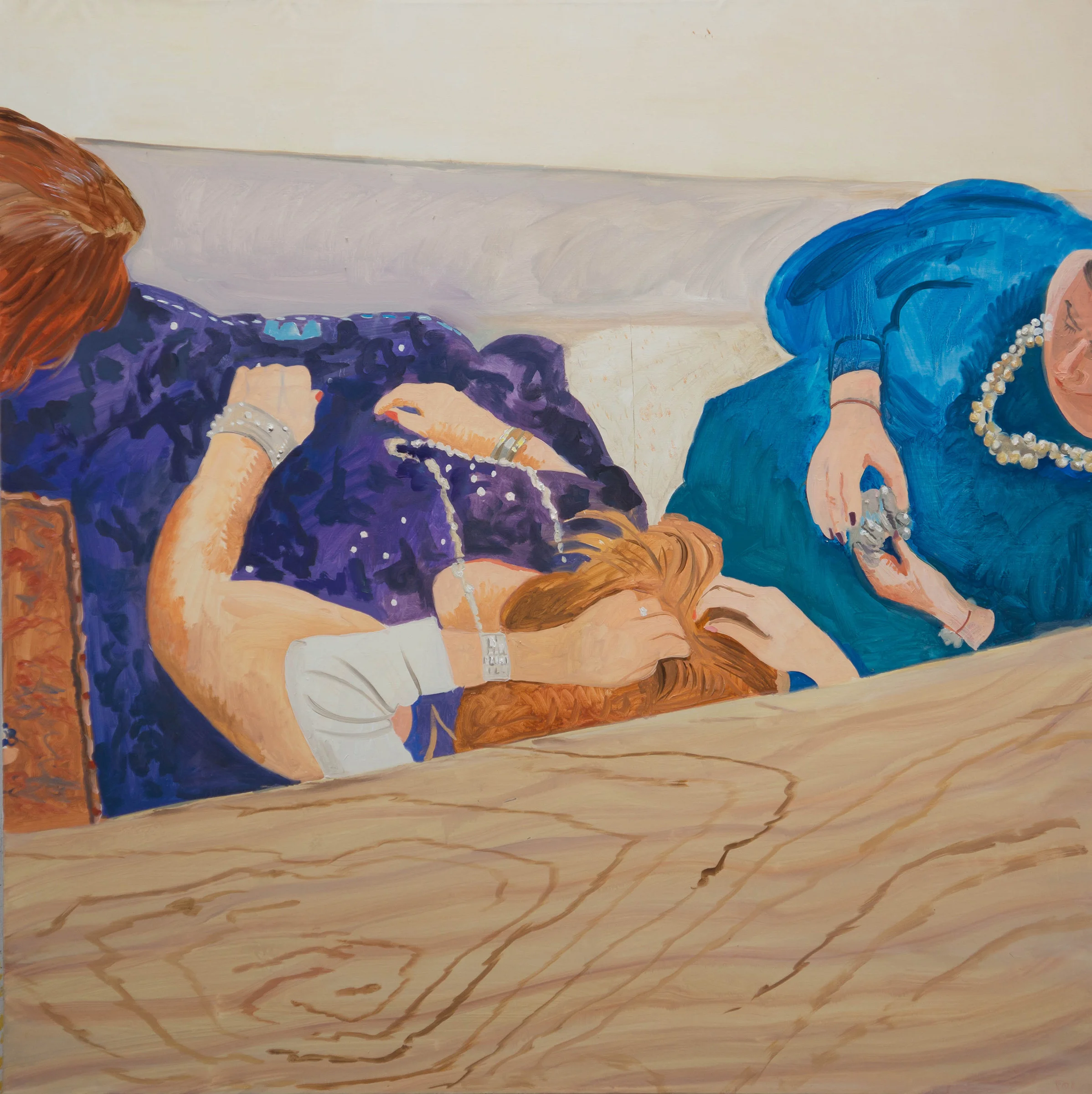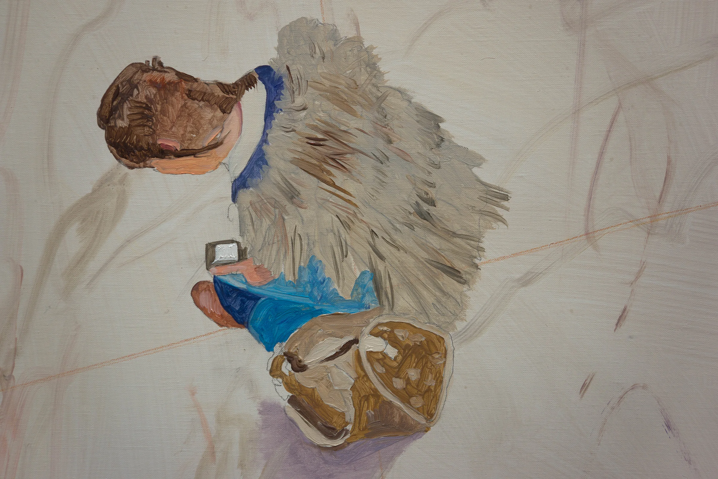 1:44pm update: i introduced a new lone figure into the composition of parade 41, while at the same time smoothing out some inconsistencies in the upper left area of the floor.this painting may now be resolved. if you compare it with yesterday's version, on the left above, you may agree that the introduction of this new lone female figure, created a balance that perhaps was lacking. as well, in her isolation, intently looking at her smart phone, she reflects the contemporary phenomena of isolation and disconnection, reflected in these young people visiting MOMA, in new york. for me however, the entire composition is more in the genre of hopper. the figures speak volumes in their silent separation.