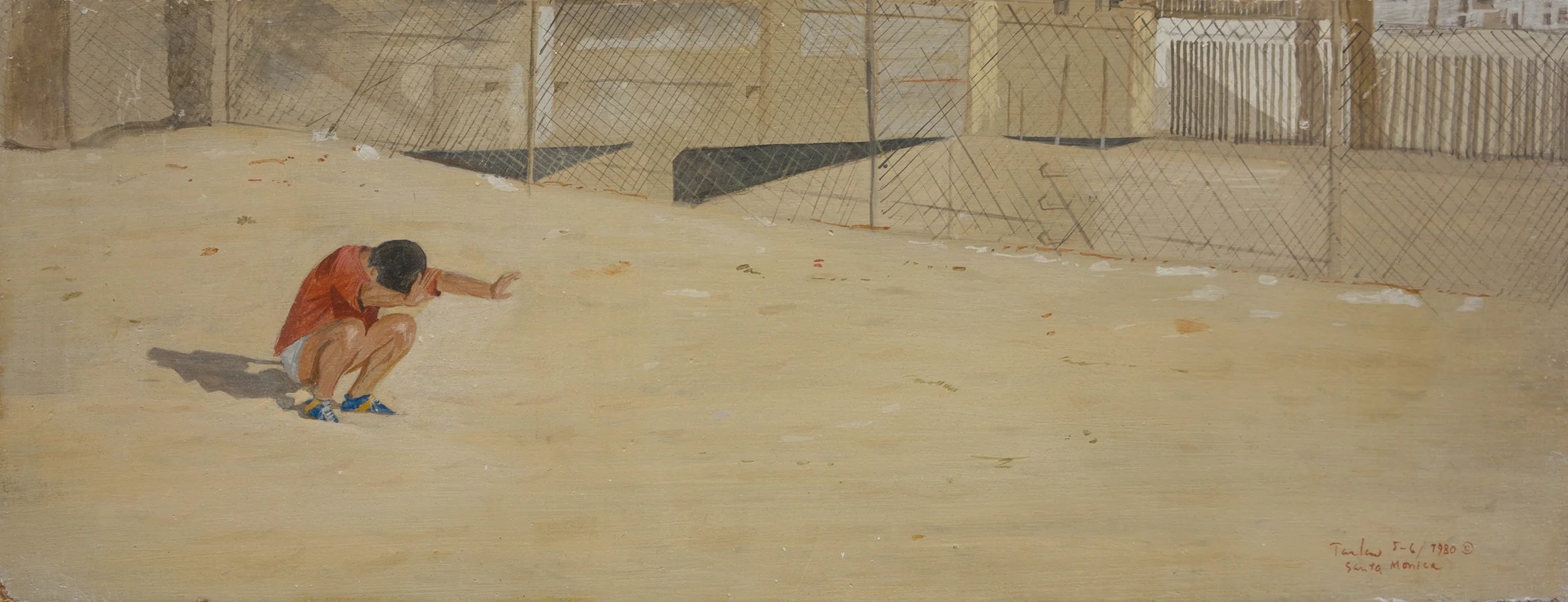 this is a painting in egg tempera on board from may-june, 1980. it is 8"x20." at the time i had just returned from 15 unbroken years in greece, and was still deeply immersed in that aesthetic, and in the medium of egg tempera. i learned to paint in that traditional byzantine and ancient greek medium from my friends and teachers, yiorgos manousakis and my former mother-in-law, niki karagatsi. my point in asking "so what else is new?" is that my preoccupation with a figure or figures engaged in everyday activities, in this case exercise on the beach in santa monica, is evident in 1980, as it was in greece a decade earlier. these figures are often isolated and usually enigmatic. what are they up to? but what are they really up to?