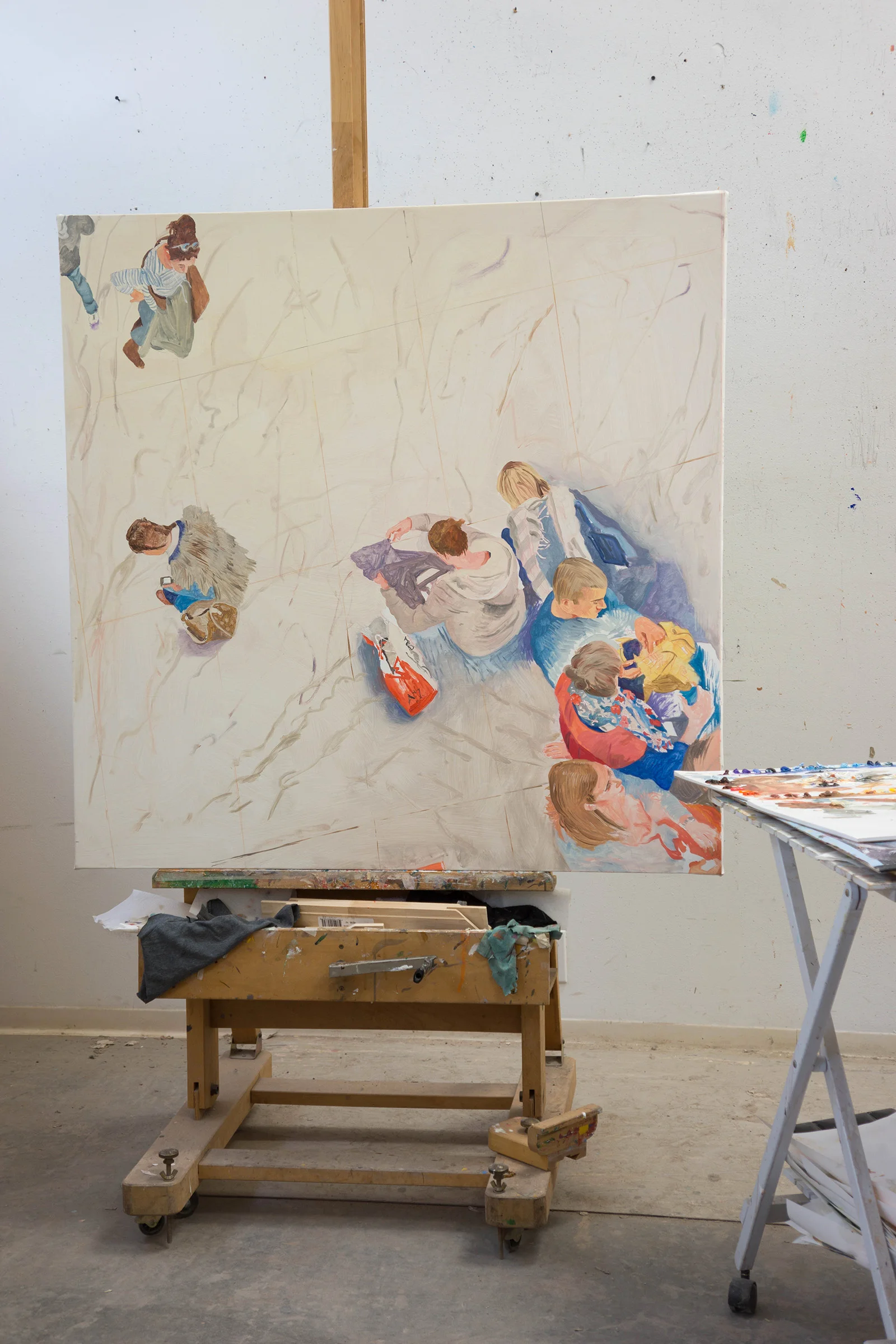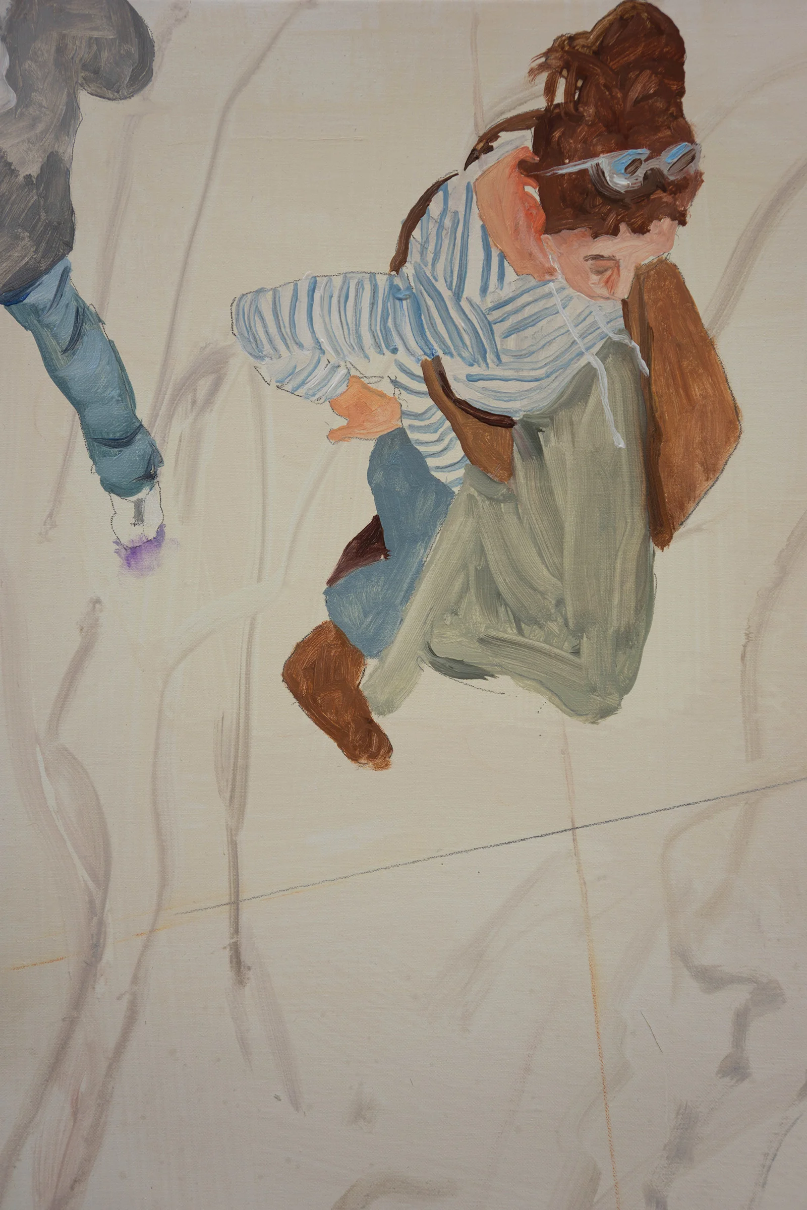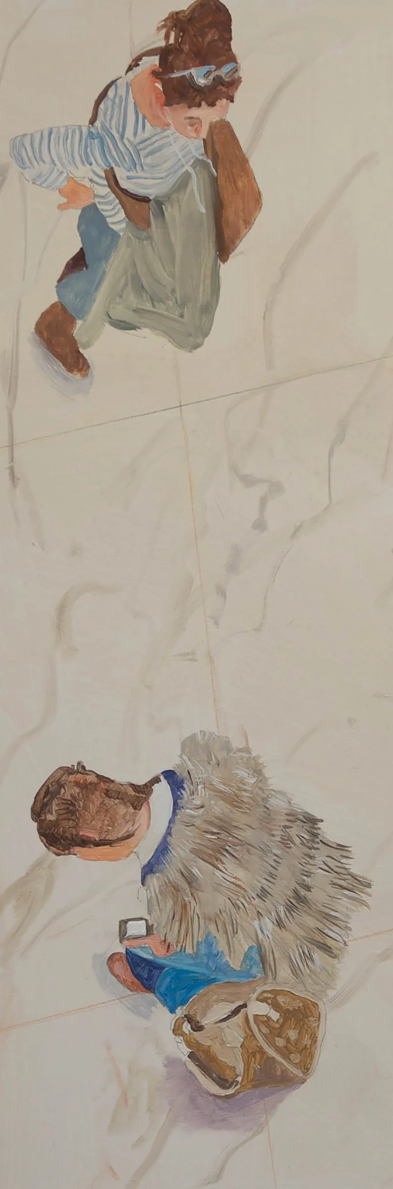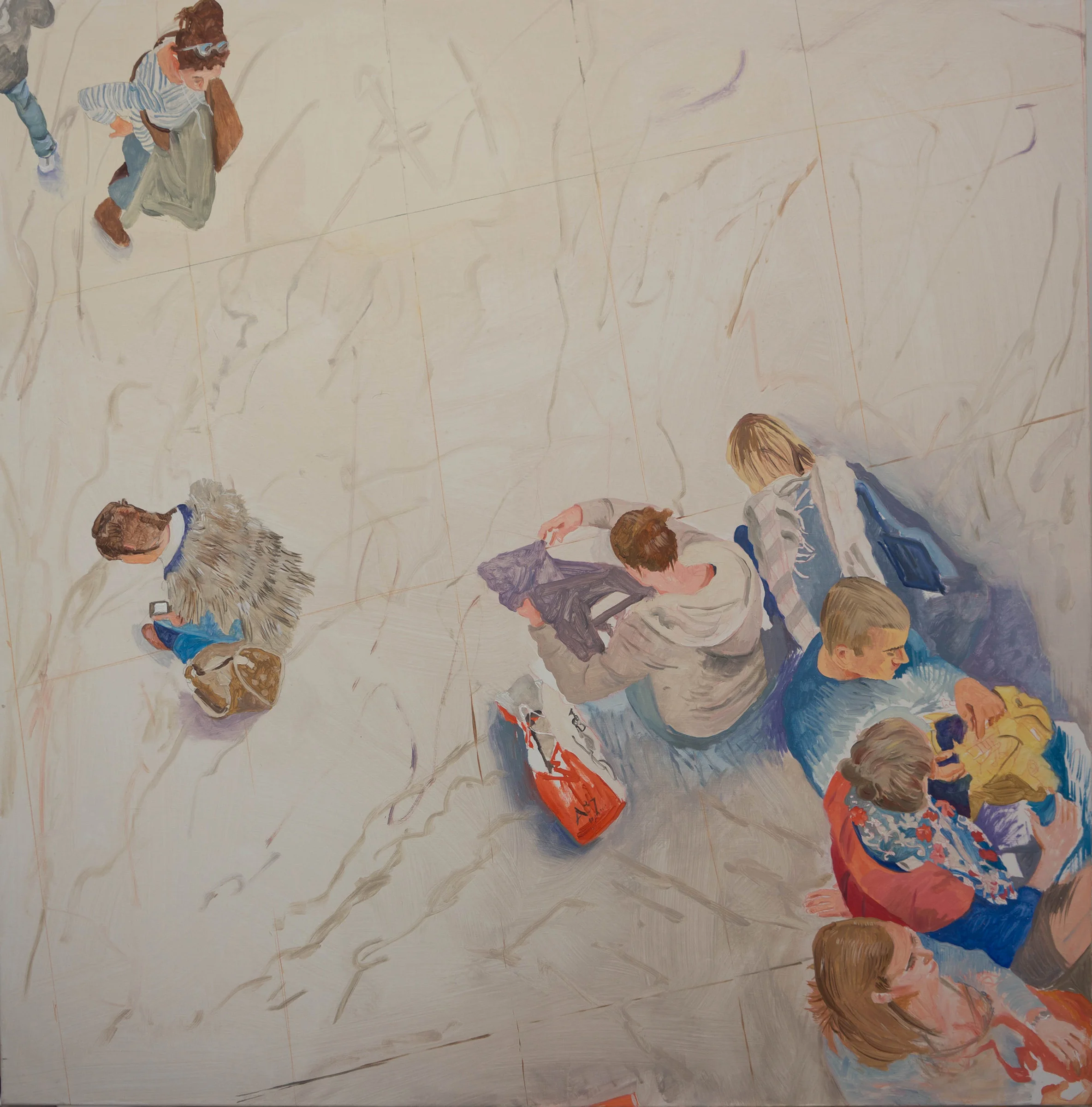 the name comes from this 2010 painting, exhibited in my solo show at skoufa gallery, athens, in 2010, and now in a private collection in athens, greece. foreshortening, or drawing and painting objects and people as seen from above, is something that comes naturally to me. when, for example, i look down from one of the levels at MOMA in new york, i always shoot photos. that angle just turns me on. so i have a lot. but it wasn't until this painting, derived from photos of a parade on skoufa street shot from a second floor balcony in 2009, that i began making paintings of images viewed from above on a regular basis. i was able to draw on the thousands of images from shots i had taken at museums, of street artists in denver, in malls, and so on. i made a series of smaller works in oil, mostly 16x16" and when my gallery owner and dear friend in houston, ron gremillion, founder of gremillion & co. fine art saw them, he asked if i could make larger versions for a solo show in november, 2015. and thus, the current series was born. thus far there are 18, which you can see by clicking on the "parade series" link, above.