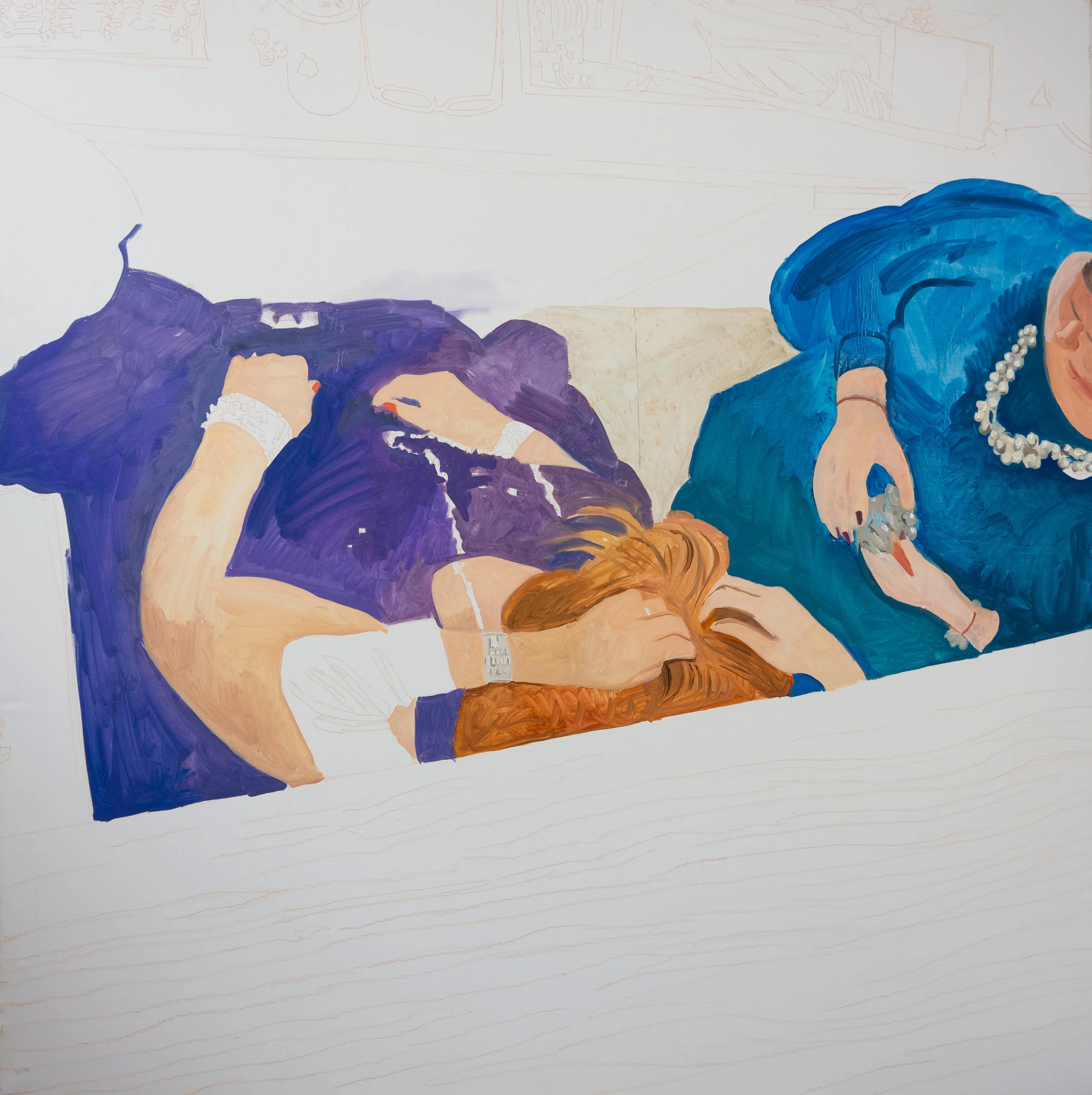 the composition of parade 37, with it's oversize, bold shapes, is more aligned with where i'm at as a result of the 14 previous parade paintings. larger, simplified shapes which can read as abstract patterning or as clothing, arms, hair are what interest me right now.