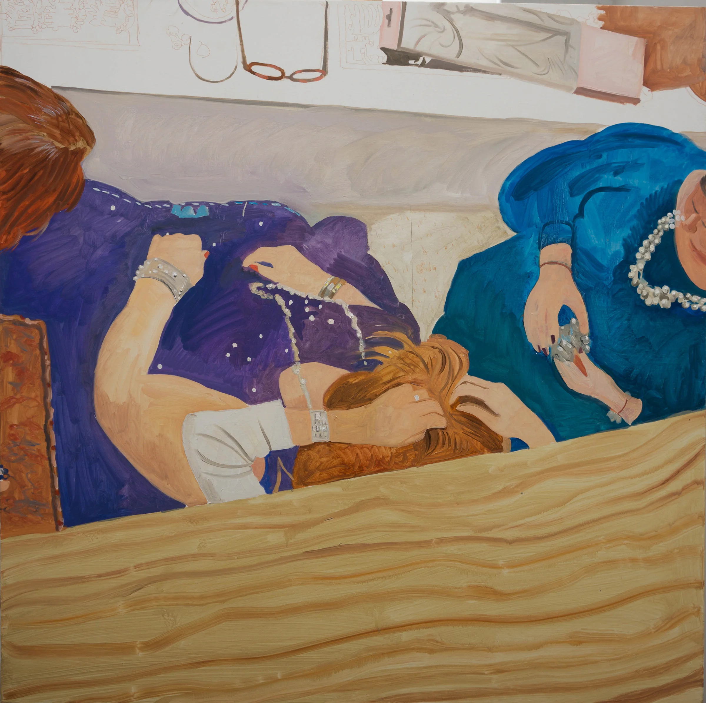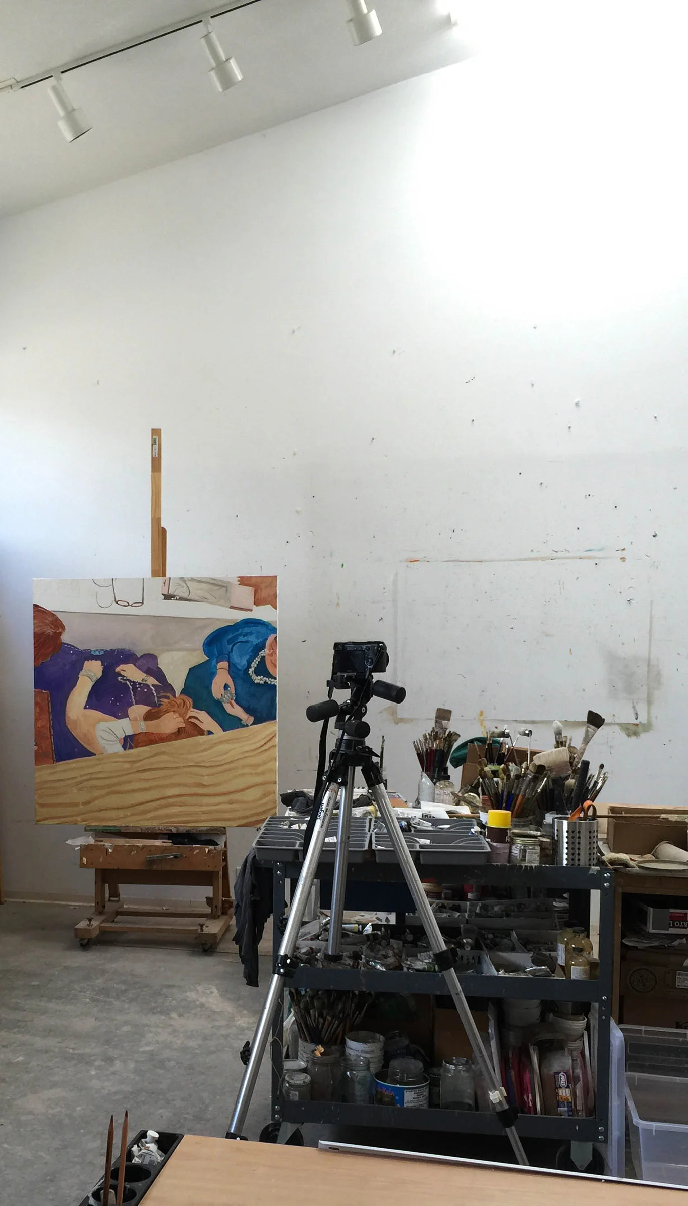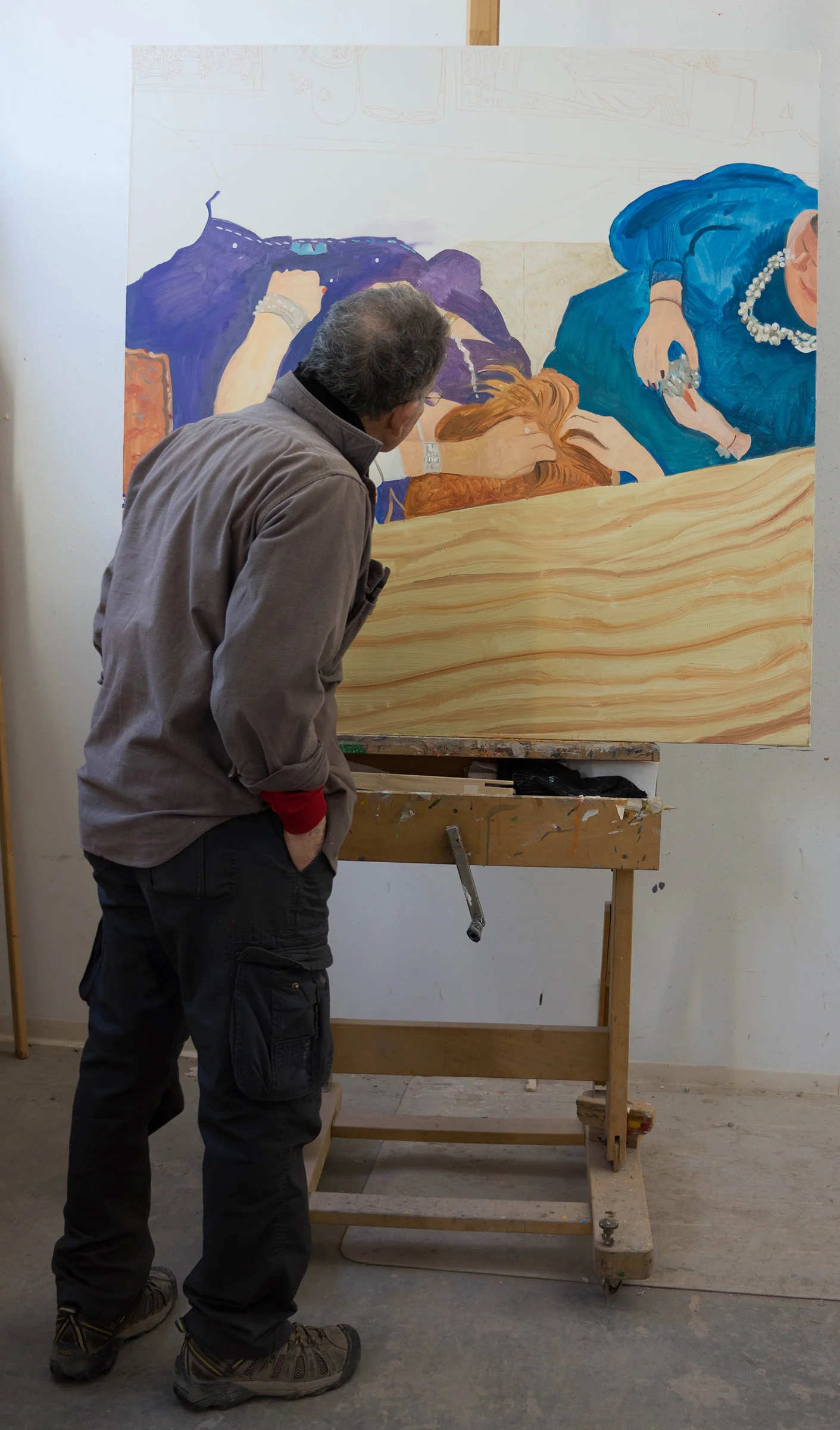 4:19pm update: it became really dark around 1:15pm, just after my last post. so i stopped working on parade 37 and instead worked on organizing my 12 or more external drives. as i worked on that project, i cast glances at parade 37. the upper third, which i had worked on this morning, didn't feel right. it seemed more and more to me that it was actually taking away from the lower portion of the painting. about 15 minutes ago, i wiped it out completely, including the underlying drawing in red pencil. you can see the result in the image to the right. the part i wiped out seems in retrospect to be a whole different painting. i'll see how i feel tomorrow morning, but right now it feels like a huge relief for all that stuff to be out of the picture.
