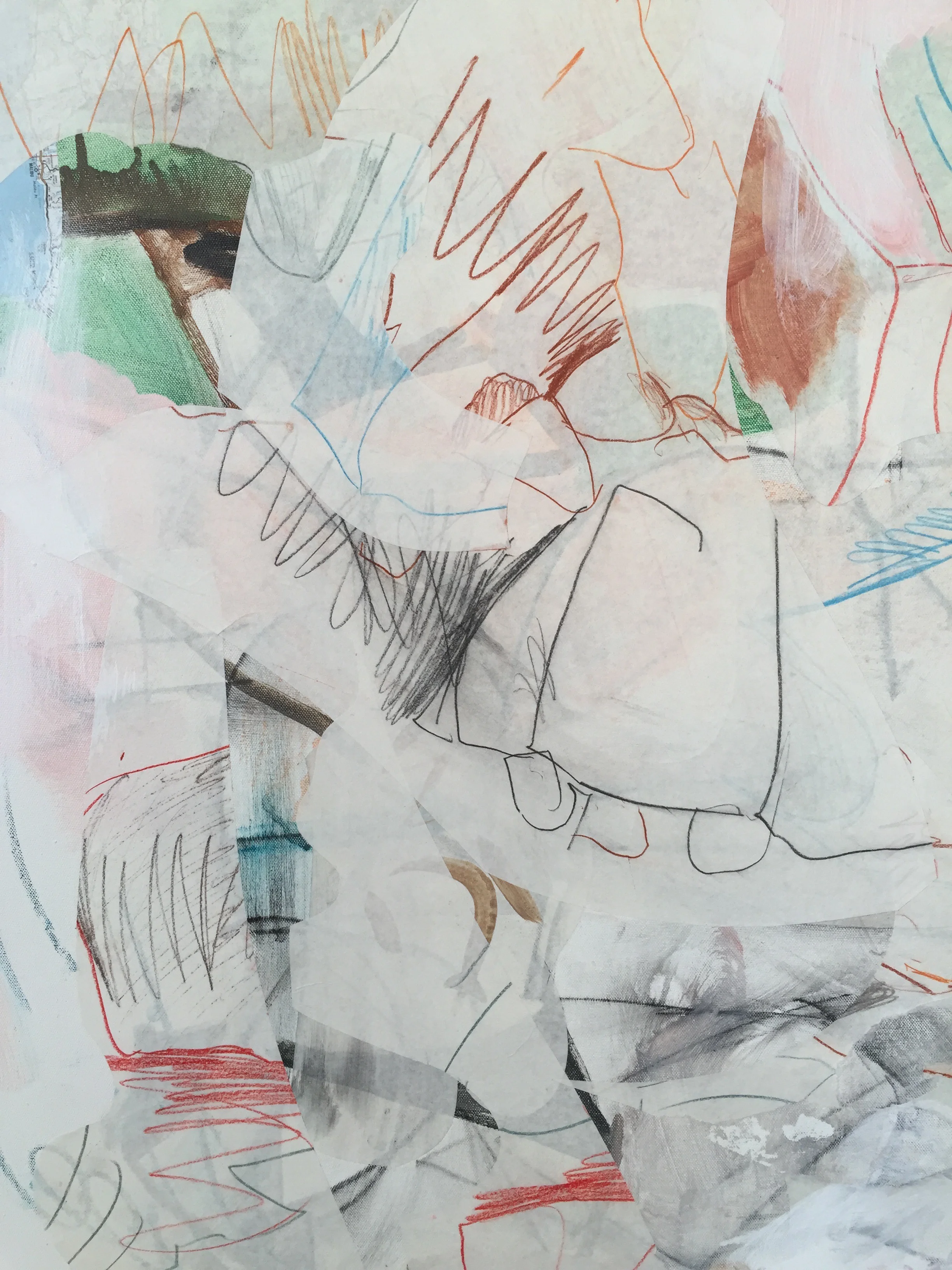 8:45 am: this is a detail of lassia, a 50"x50" collage on canvas which is in our bedroom
