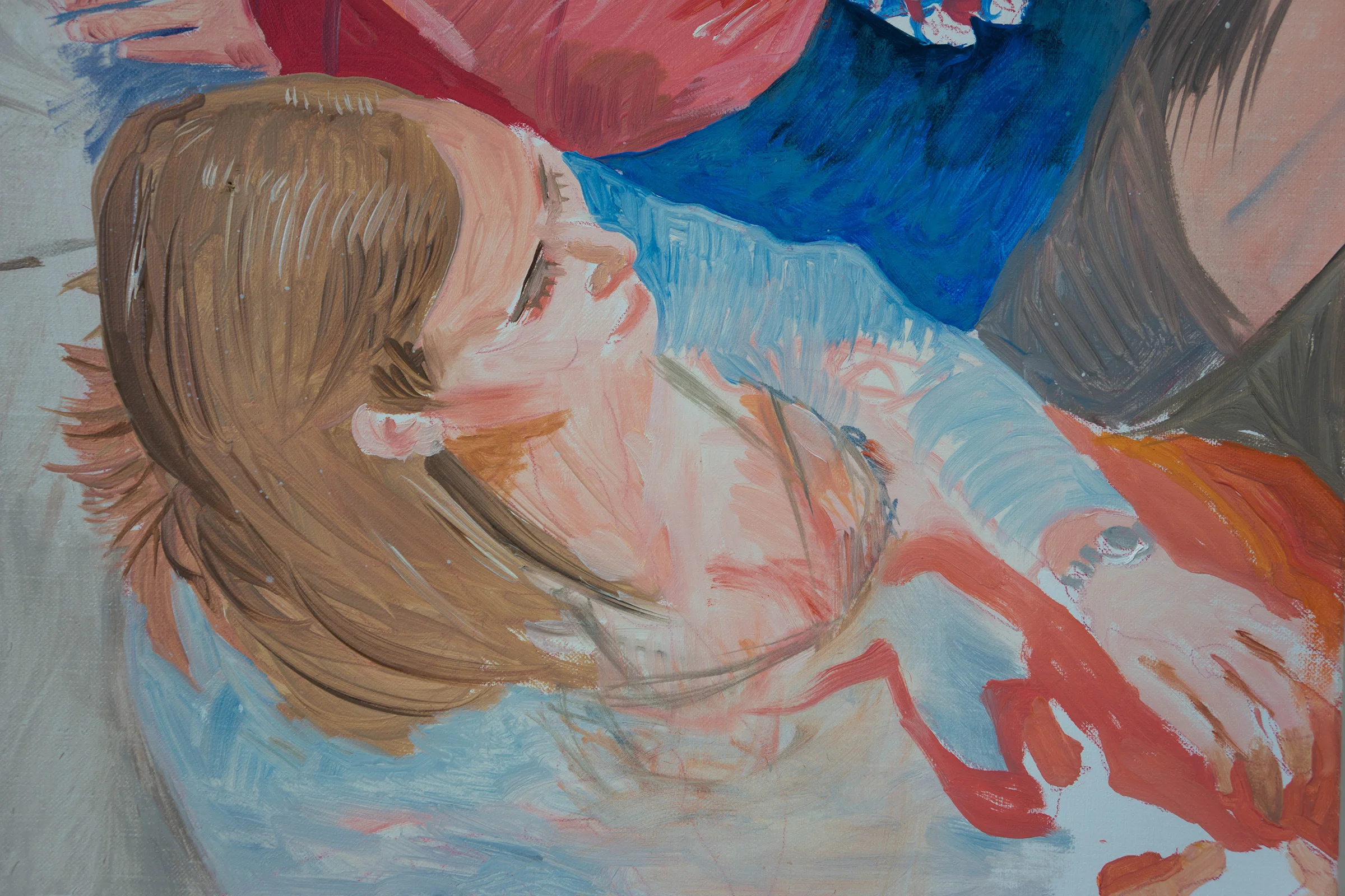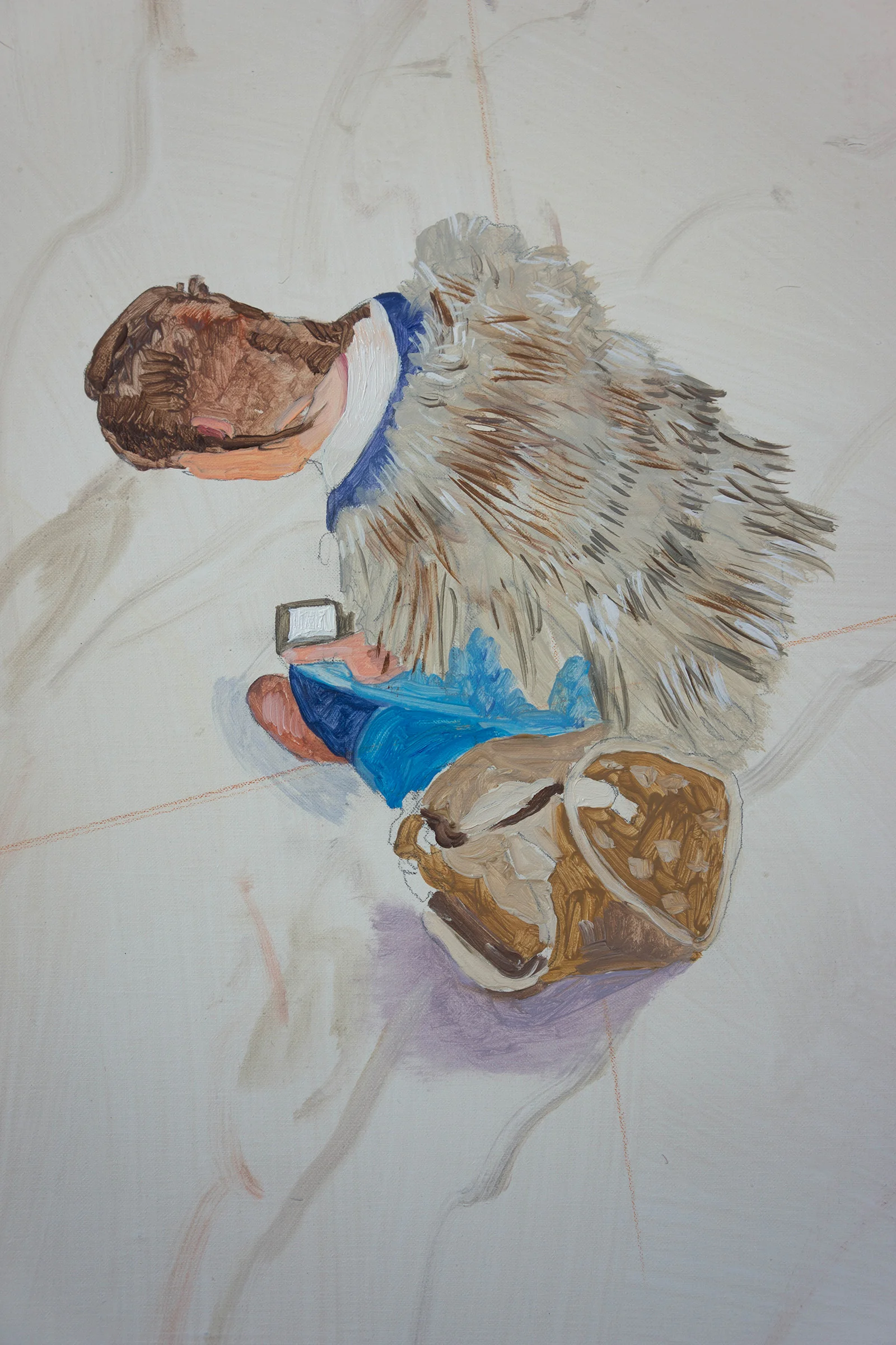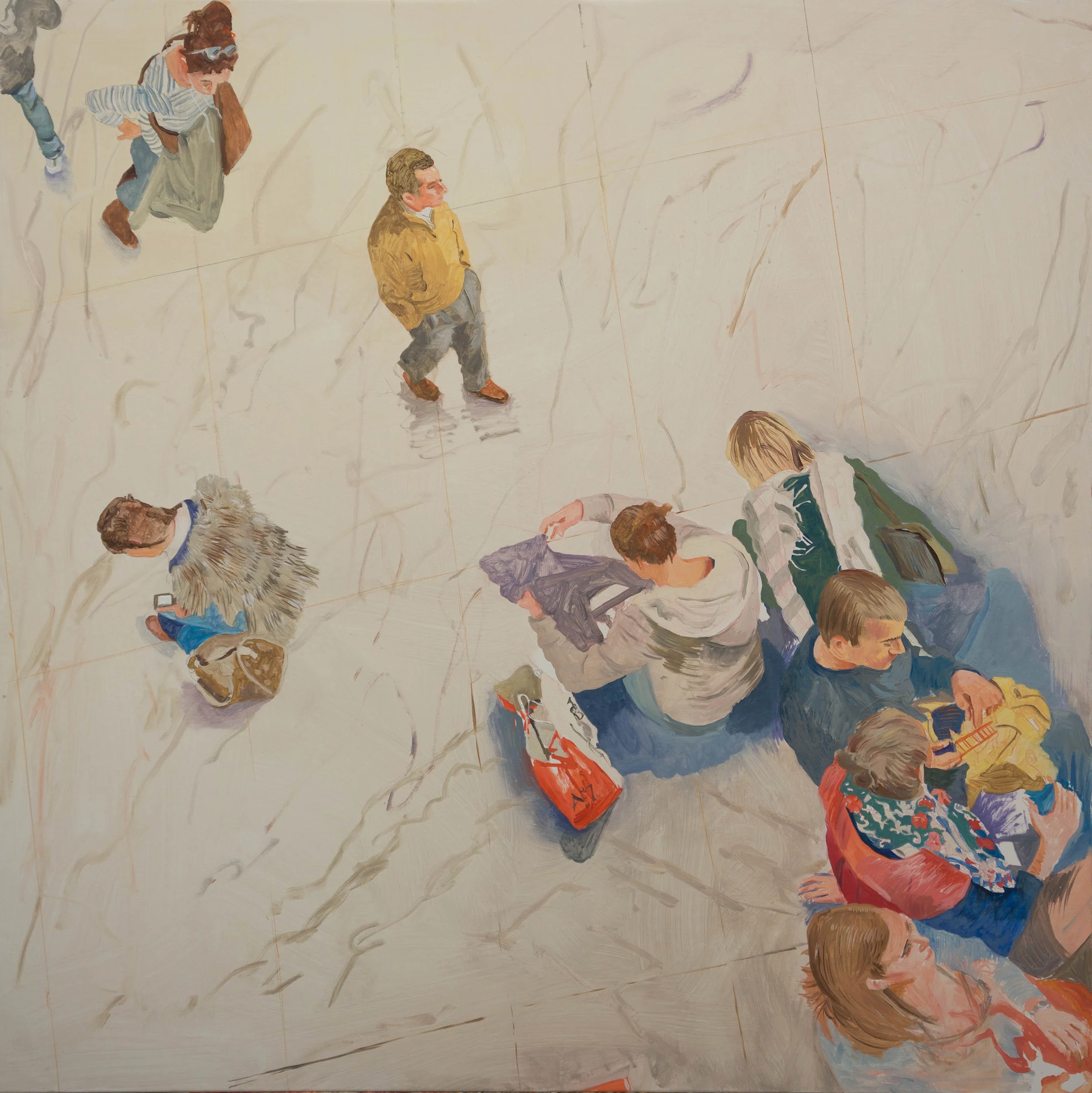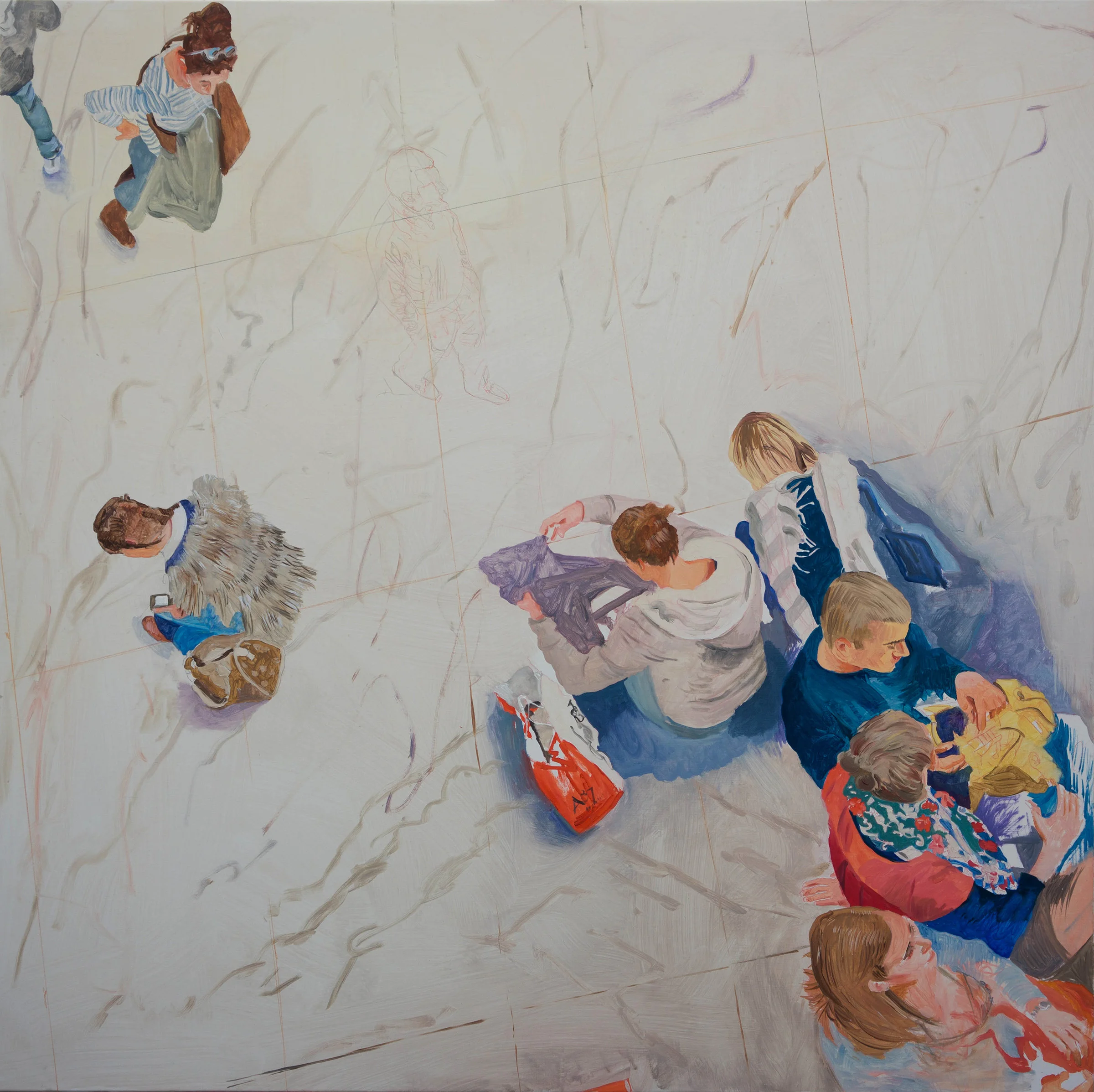 my abstract compositions and collages depend entirely upon the essential elements of painting: color, composition, drawing, etc. these parade paintings, all focused as they are on views of people from above, are also communicating my experience of the human condition. i haven't set out to deliver a message. but there does seem to be one. the way we are in our bodies, they way we interact, or not, is simply beautiful. it is my choice to include mostly meditative moments, where people come together and are largely steeped in their own worlds and thoughts. occasionally we interact. our environments, including our interactions, dictate how we hold or place our bodies. sometimes, as happens in the netflix serial sense8, which we are currently so absorbed in, we recognize one another. some previously unsuspected connection.