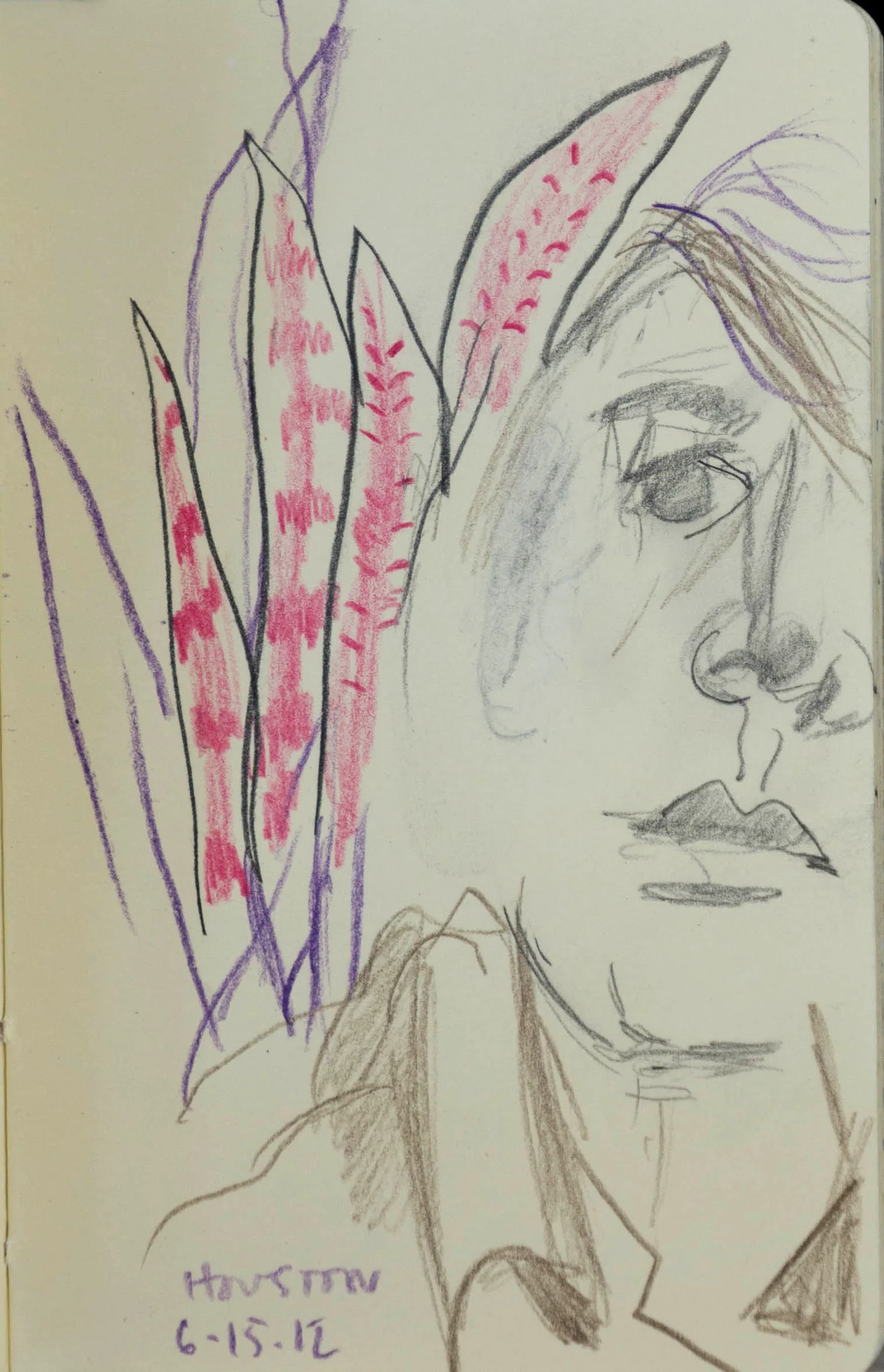 on the left, a drawing of mikela, from one of my houston sketchbooks, from 2012. we were there for the summer so i could have some treatment. we were staying at our friends chris & anne's guest apartment. it was there i began experimenting with abstract collages.